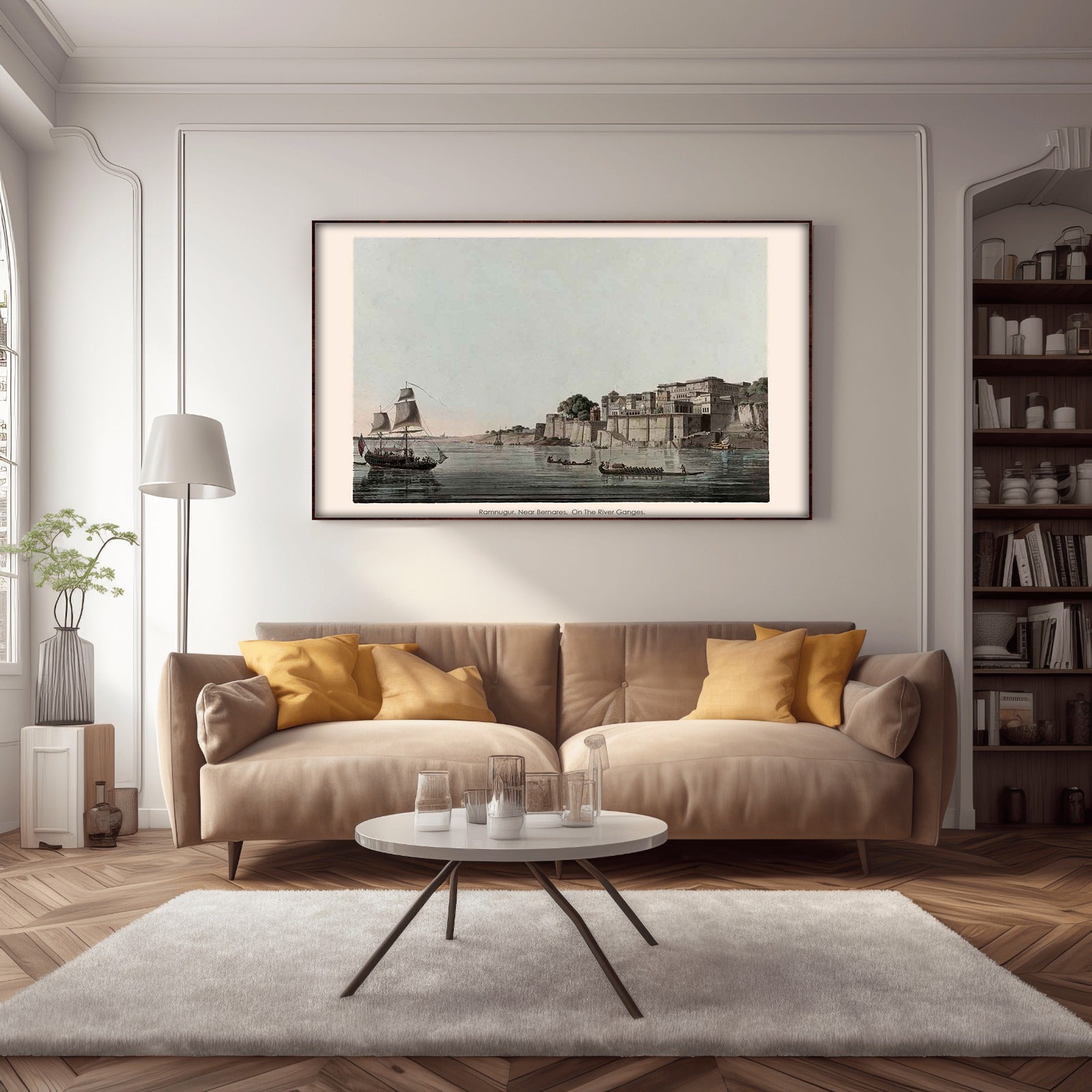 Explore the cultural and scenic beauty of Ramnagar with this stunning print of Boats on the Ganges. Admire the intricate details and vibrant colors as you transport yourself to the bustling riverfront. Perfect for any art enthusiast or lover of Indian culture.