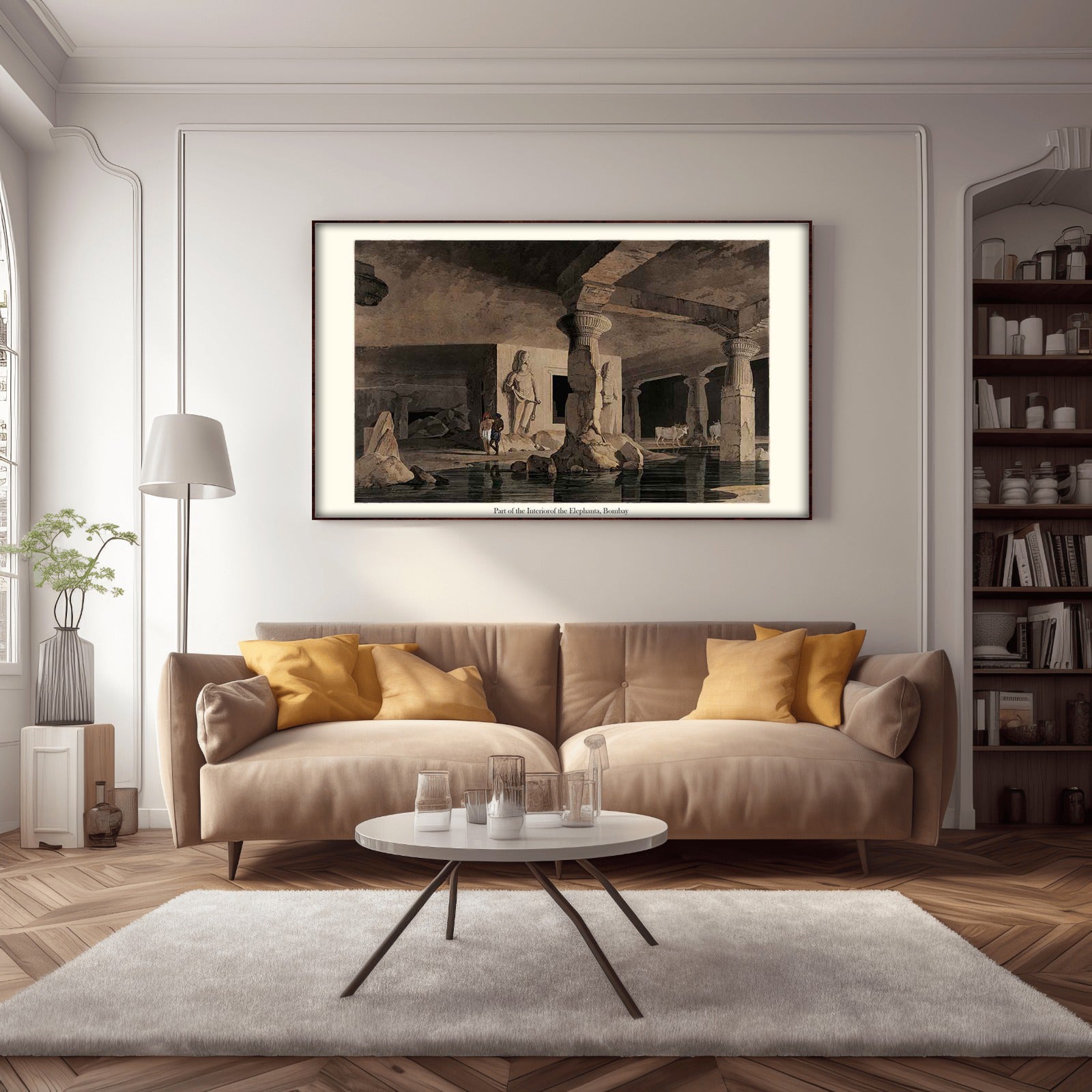 Discover the stunning interior of a cave on the Island of Elephanta near Bombay through this professionally printed image. Experience the beauty of this historic site and add a touch of cultural flair to your space. Perfect for those with an interest in ancient cultures and architectural wonders.