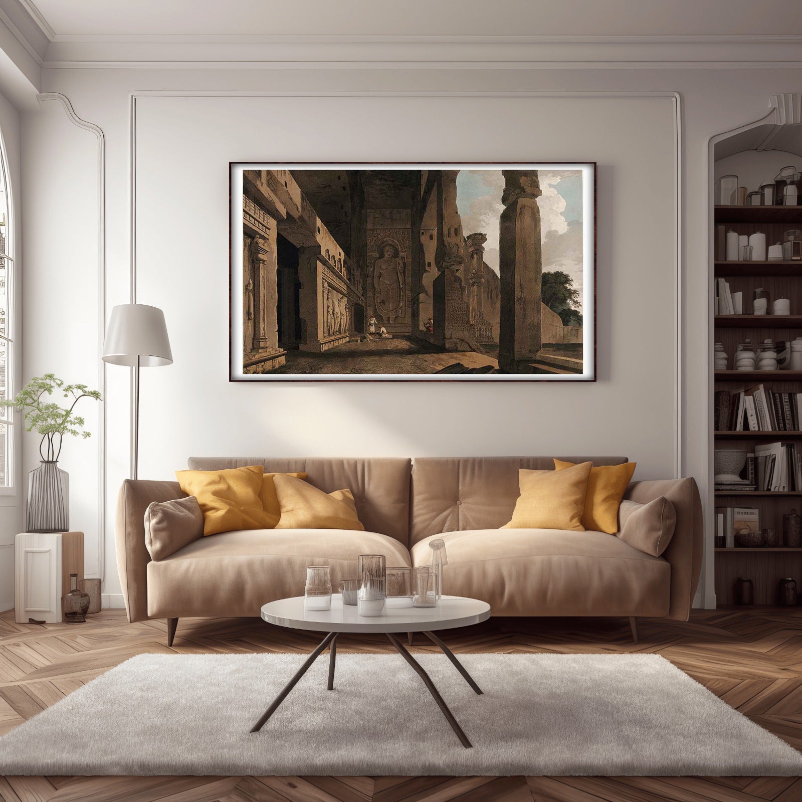 This print features the stunning entrance to the Great Chaitya Temple on the Island of Sa. An educational and objective portrayal of this historic structure, it showcases the intricate architecture and offers a glimpse into the rich history of the island. Perfect for history buffs, travelers, and art lovers alike.