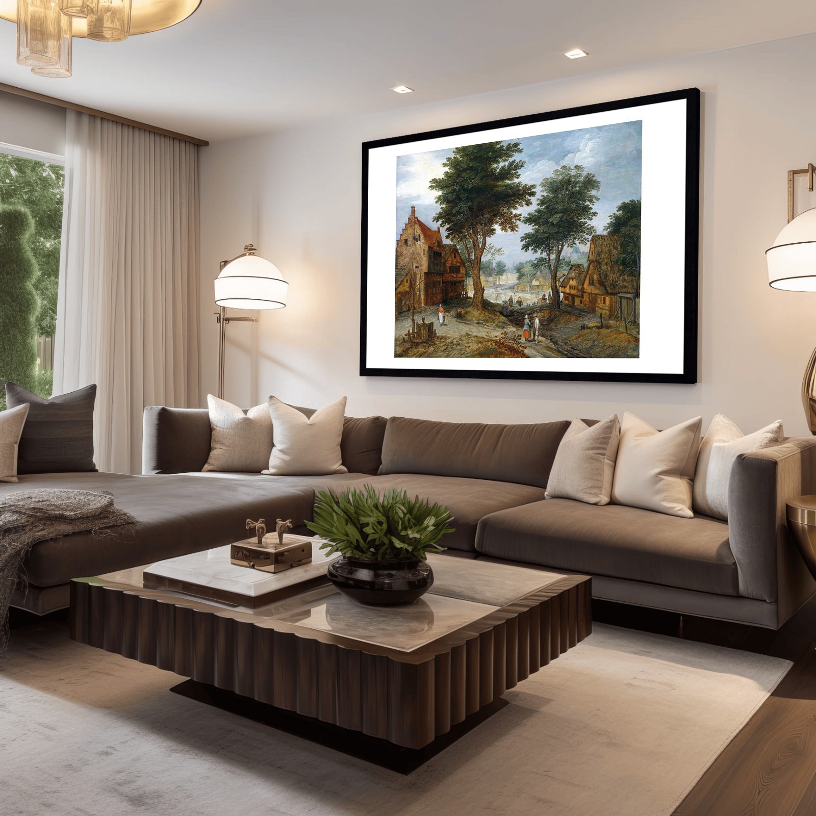 This Bustling Village Landscape With Trees Print captures the lively charm of a bustling village scene. With intricate detailing and vibrant colors, this print adds a touch of liveliness to any room. Crafted with high-quality materials, this print is a must-have for any art enthusiast looking to add a touch of nature to their home.