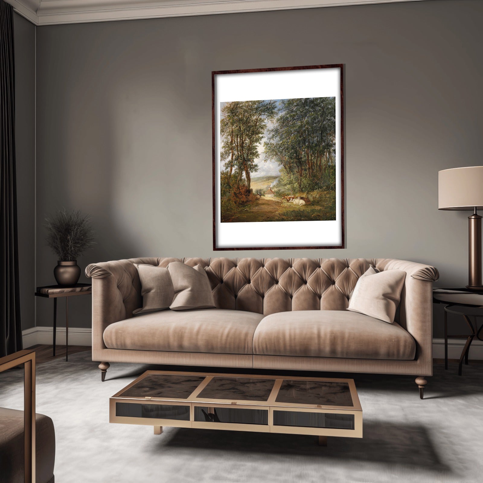 This 1851 print features a serene forest landscape with resting cows. Enjoy the beauty of nature in your own home with this exquisite artwork. Made with high-quality materials, this print is a perfect addition to any art collection. Experience the tranquility and serenity of the countryside through this stunning piece.