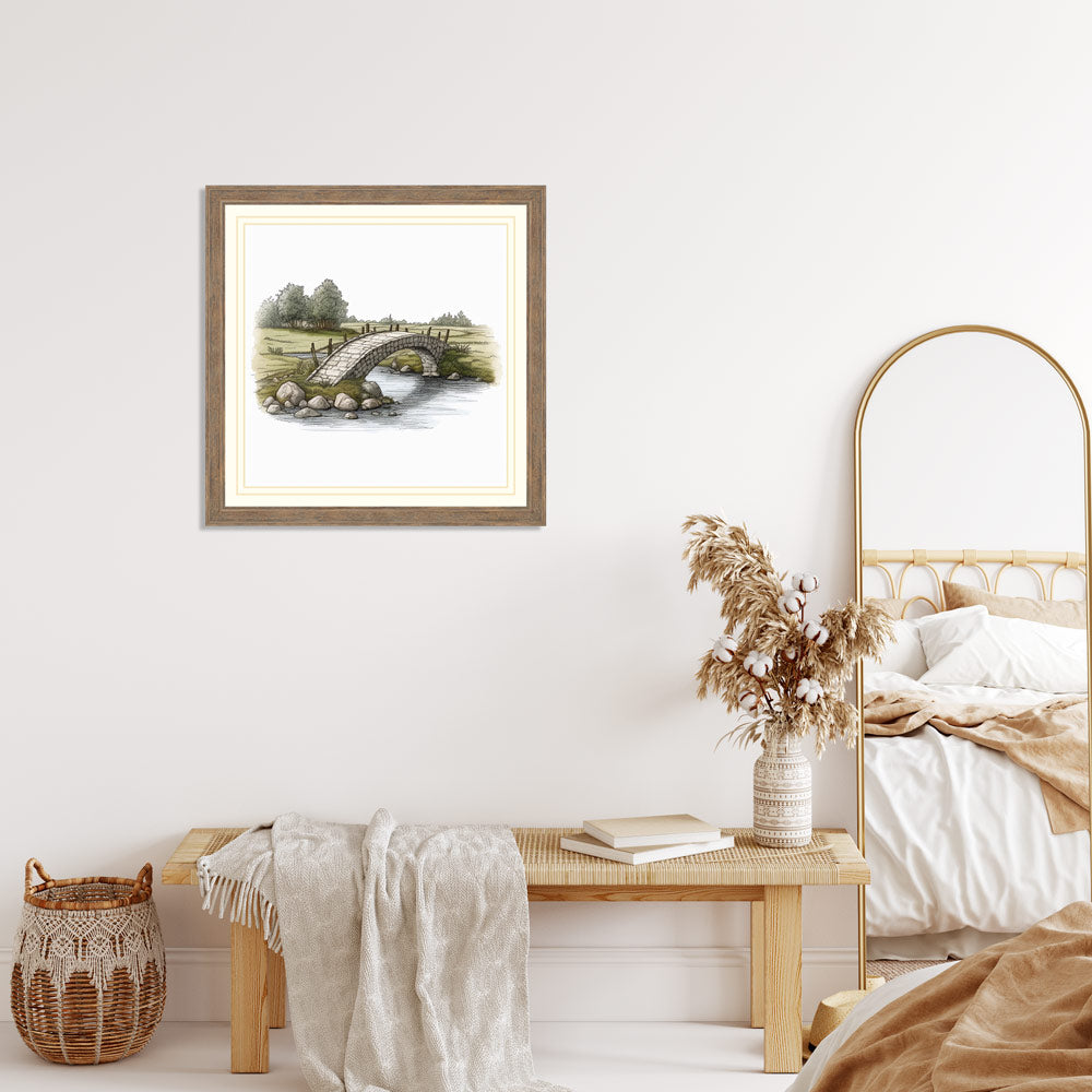 Reminiscent of the classic art style of the 19th century, this water colour print features a tranquil bridge over a lazy river - perfect for any wall in your home. Enjoy a simple, yet elegant piece of artwork that will definitely stand out.