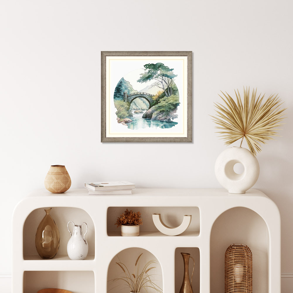 Reminiscent of the classic art style of the 19th century, this water colour print features a tranquil bridge over a lazy river - perfect for any wall in your home. Enjoy a simple, yet elegant piece of artwork that will definitely stand out.