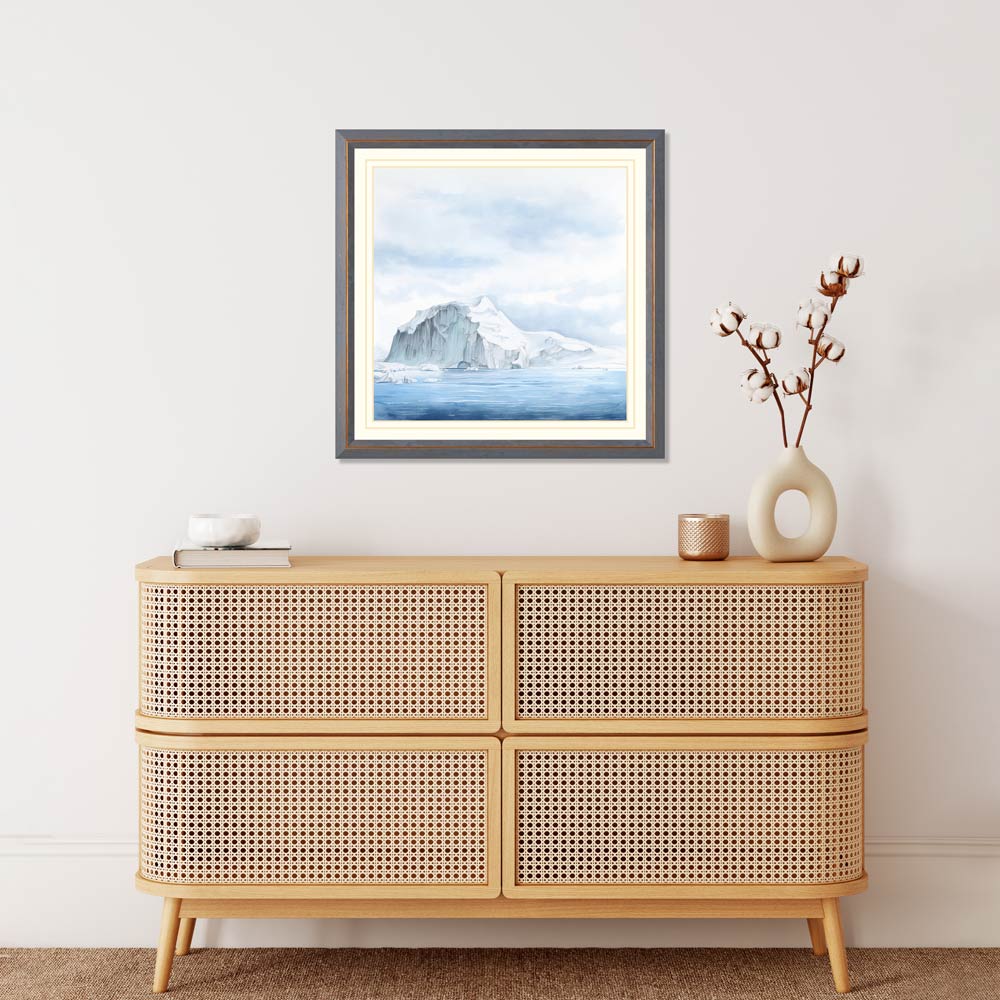 Achieve a unique, high-quality look in your home with this stunning watercolor print of an iceberg in the ocean with mountains. The print captures the beauty of this natural scene in a detailed, vivid design that will transform any room.