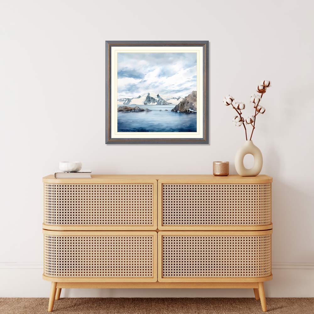 Achieve a unique, high-quality look in your home with this stunning watercolor print of an iceberg in the ocean with mountains. The print captures the beauty of this natural scene in a detailed, vivid design that will transform any room.