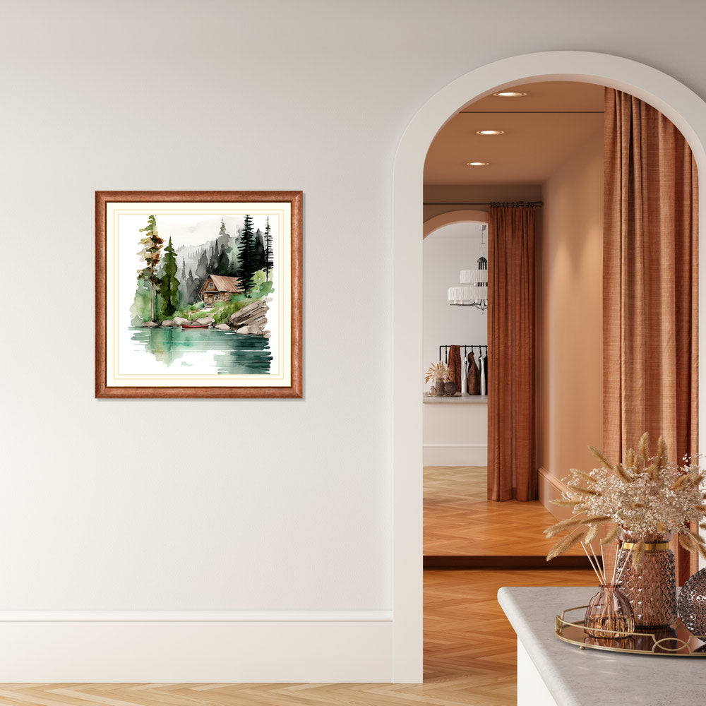 Add a touch of nature to your home with this beautiful water colour print of a lakeside cottage. This delightful image will be a stunning addition to your walls, sure to bring a sense of peace and tranquility as you enjoy the beauty of the outdoors.