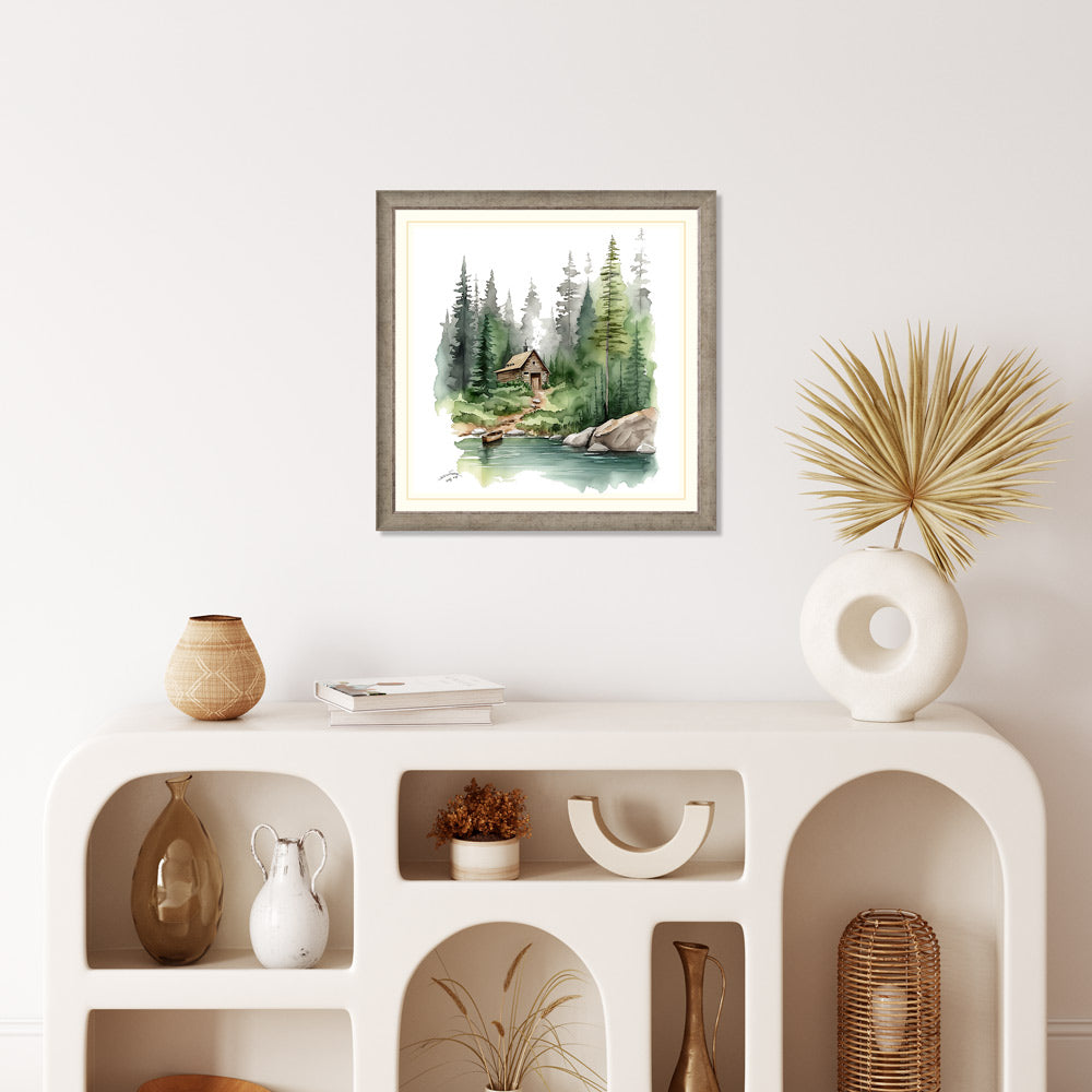 Add a touch of nature to your home with this beautiful water colour print of a lakeside cottage. This delightful image will be a stunning addition to your walls, sure to bring a sense of peace and tranquility as you enjoy the beauty of the outdoors.