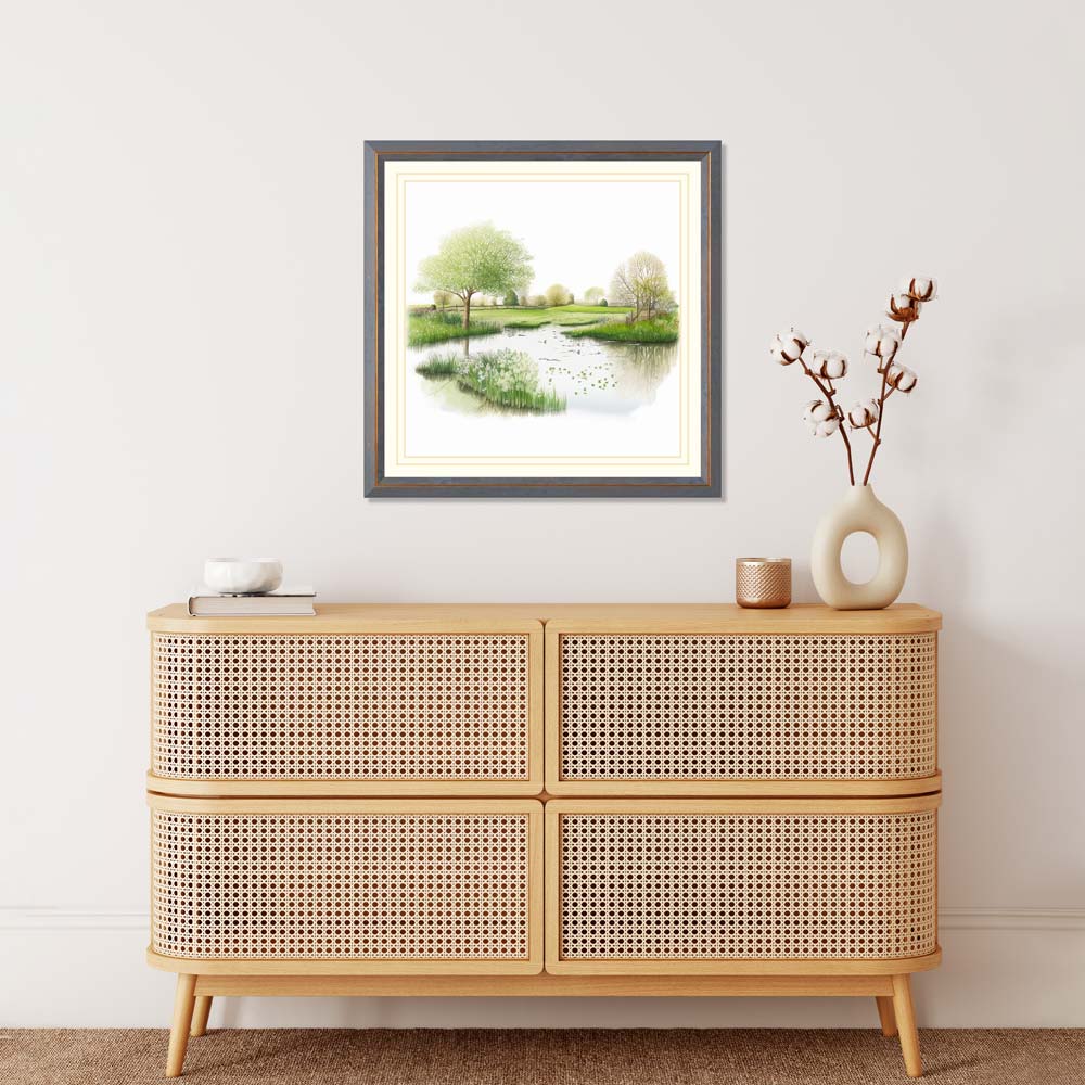 Elevate your space with this high-quality water colour print of a pond filled with green grassy bank. Its detailed visuals will bring a calming atmosphere into your home or office. The perfect addition for nature-lovers, this vibrant-hued decoration is sure to make a statement.