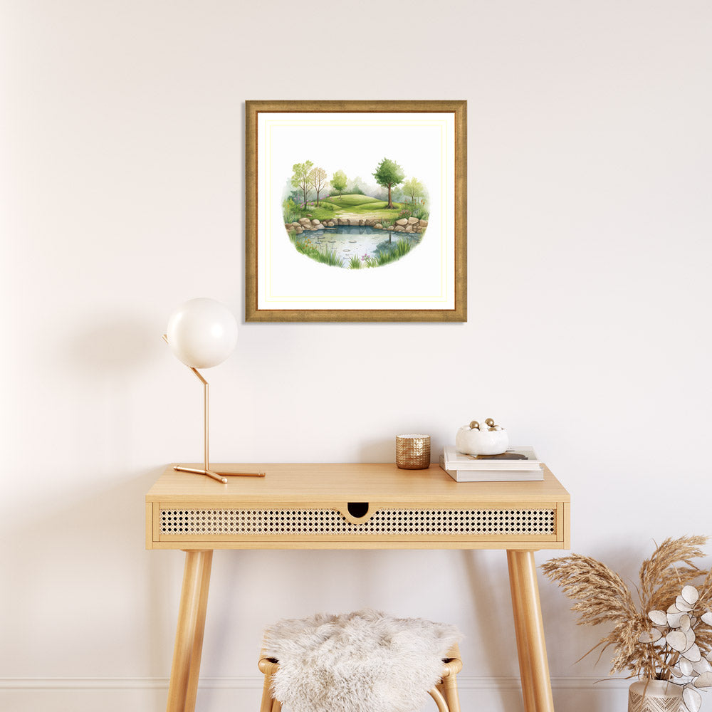 Elevate your space with this high-quality water colour print of a pond filled with green grassy bank. Its detailed visuals will bring a calming atmosphere into your home or office. The perfect addition for nature-lovers, this vibrant-hued decoration is sure to make a statement.