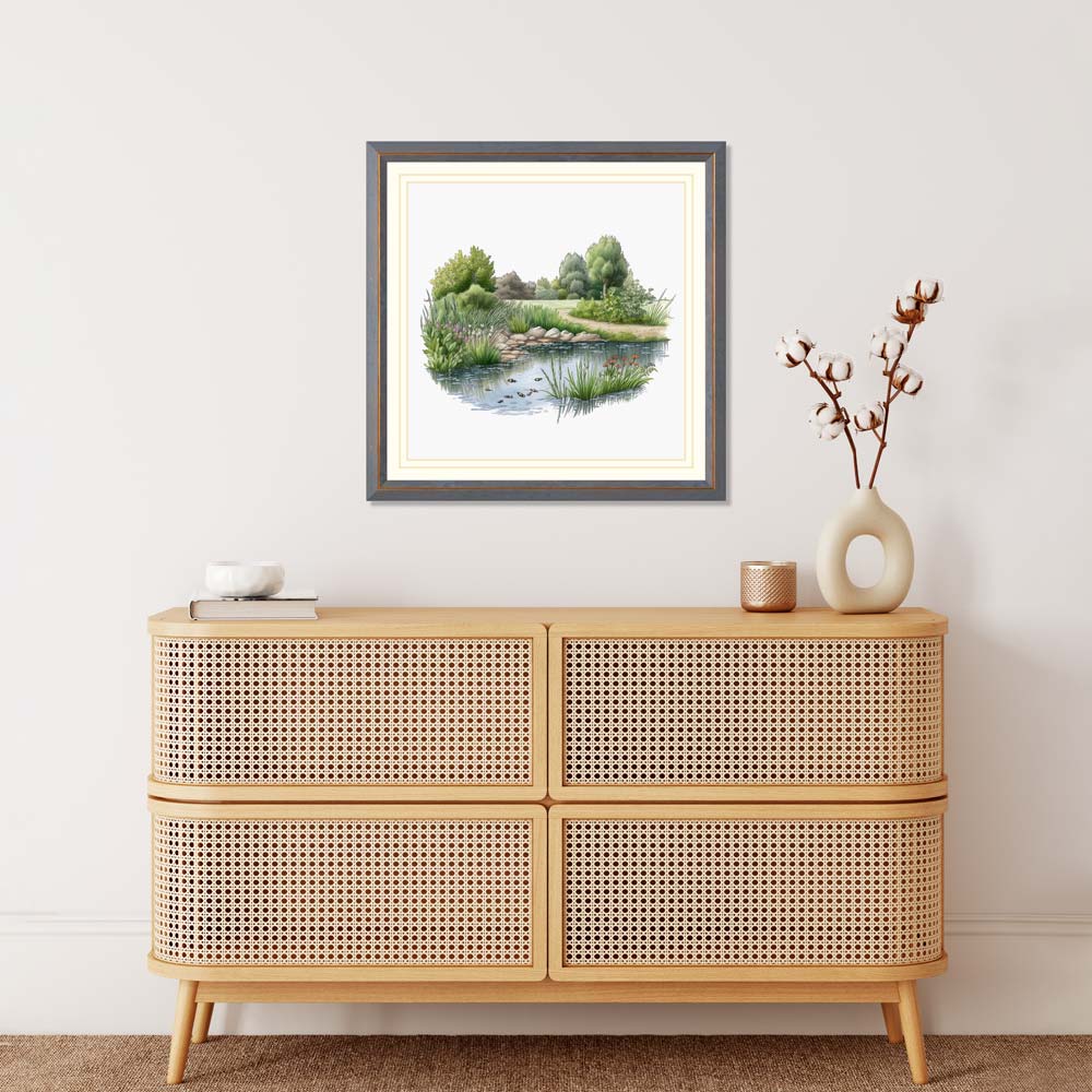 Elevate your space with this high-quality water colour print of a pond filled with green grassy bank. Its detailed visuals will bring a calming atmosphere into your home or office. The perfect addition for nature-lovers, this vibrant-hued decoration is sure to make a statement.