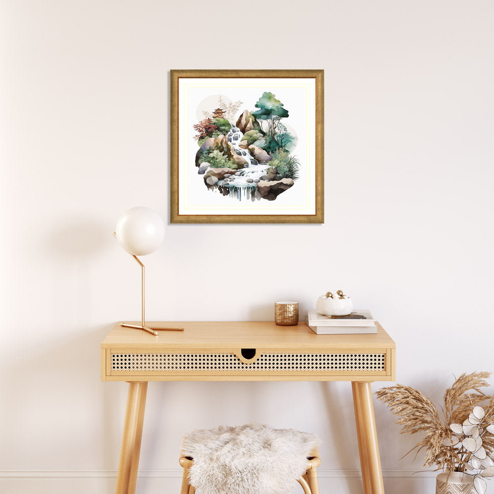 Enjoy the calming beauty of a serene mountain scene with this unique watercolor print. Featuring a small temple monument beside a clear waterfall with lush greenery, this print is sure to bring peace and serenity to your home. Perfect for any room, its vivid colors and precise details will create a truly stunning piece of art.