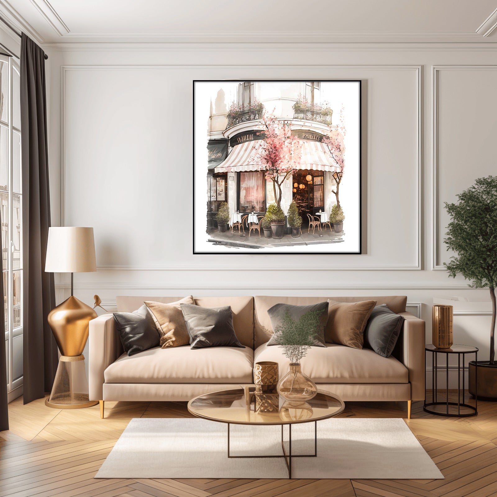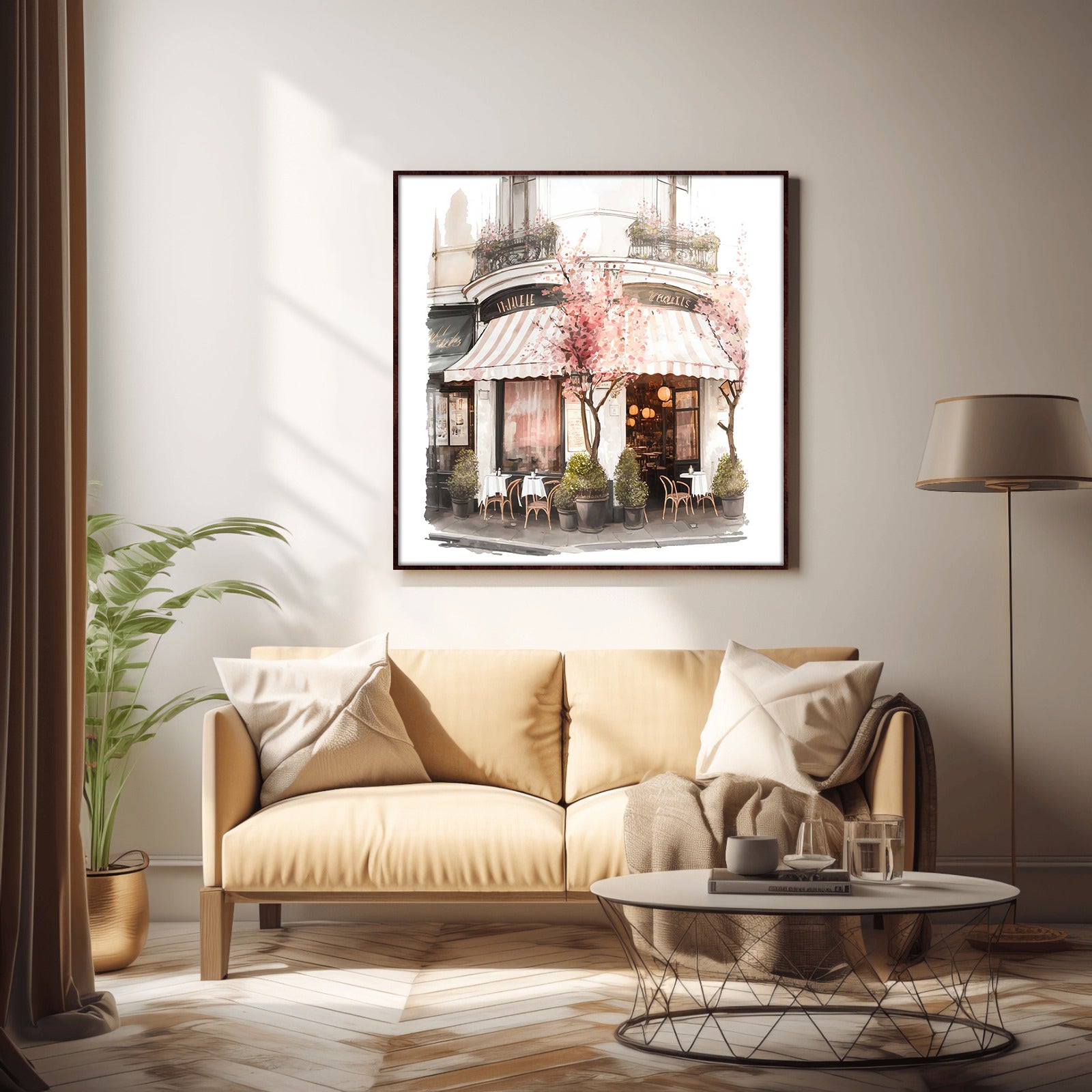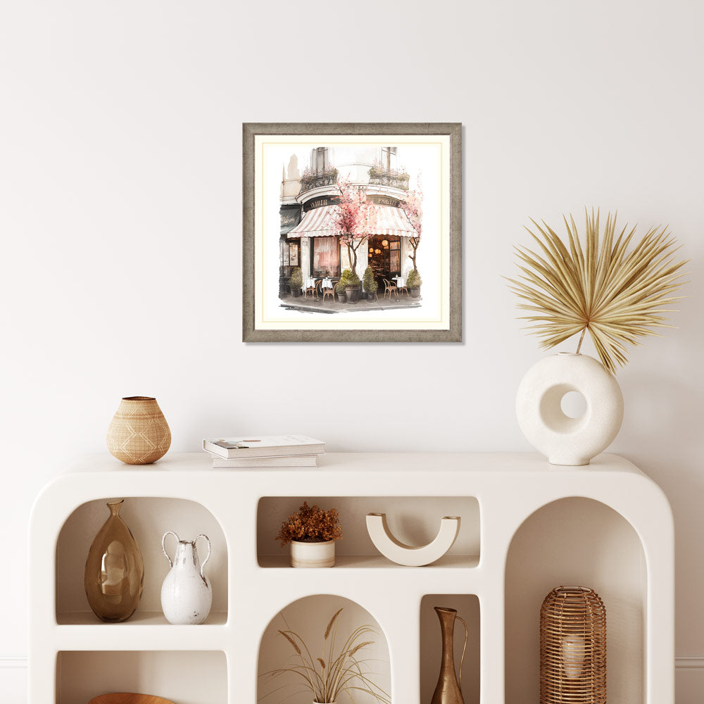 This stunning water colour print of a coffee shop surrounded by beautiful blooms is a must-have for any home. With its vibrant colours and intricate details, this piece is sure to bring a sense of life and style to any room.
