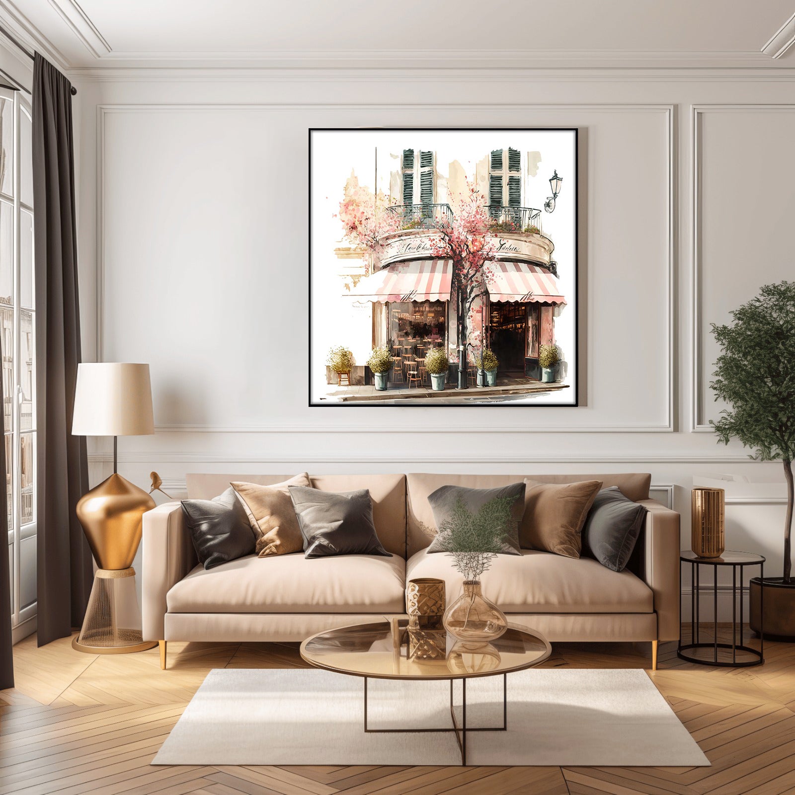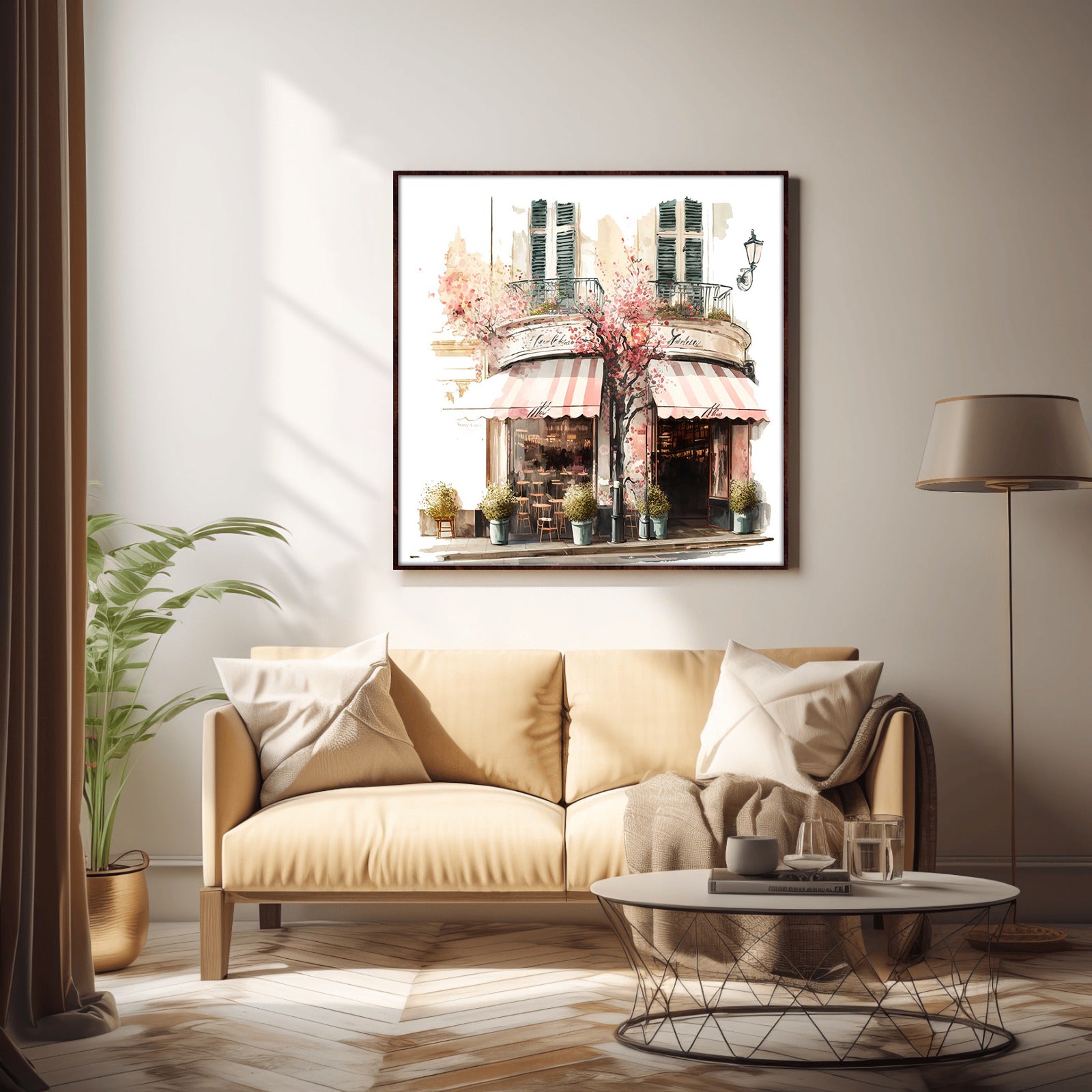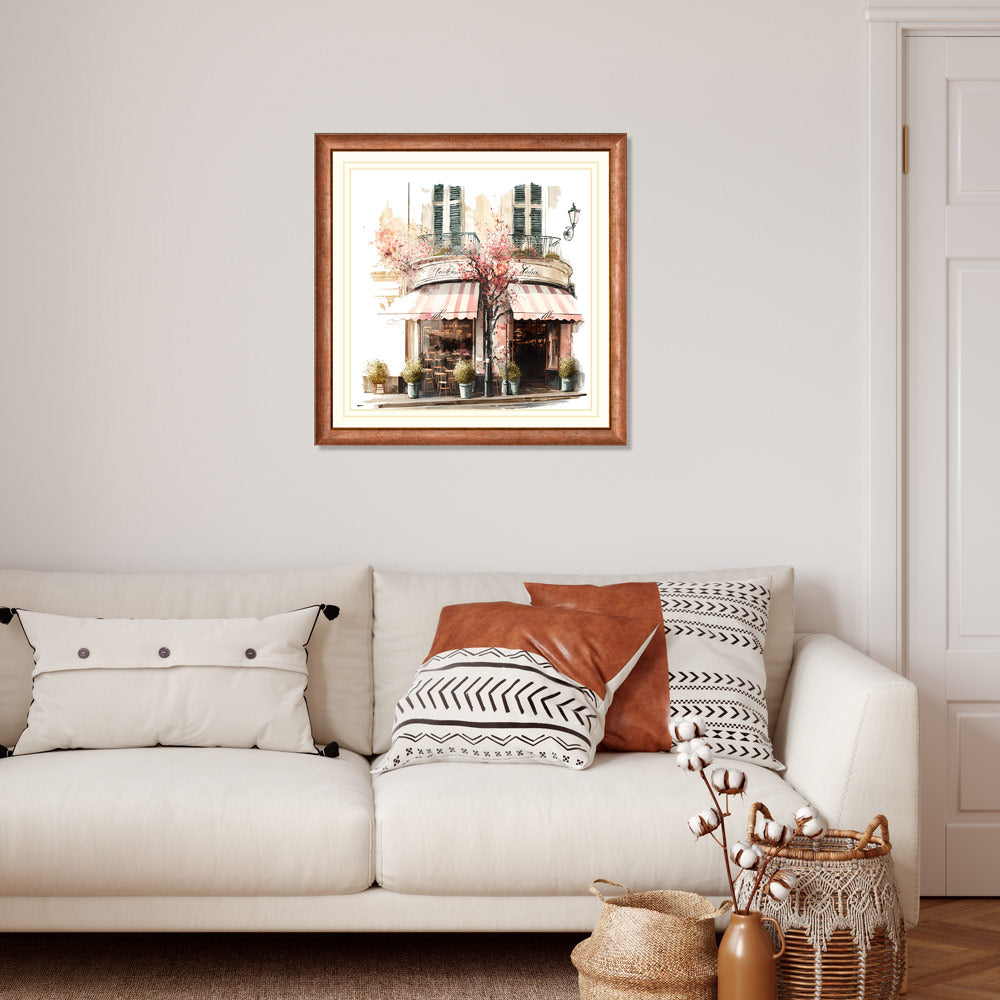 This stunning water colour print of a coffee shop surrounded by beautiful blooms is a must-have for any home. With its vibrant colours and intricate details, this piece is sure to bring a sense of life and style to any room.