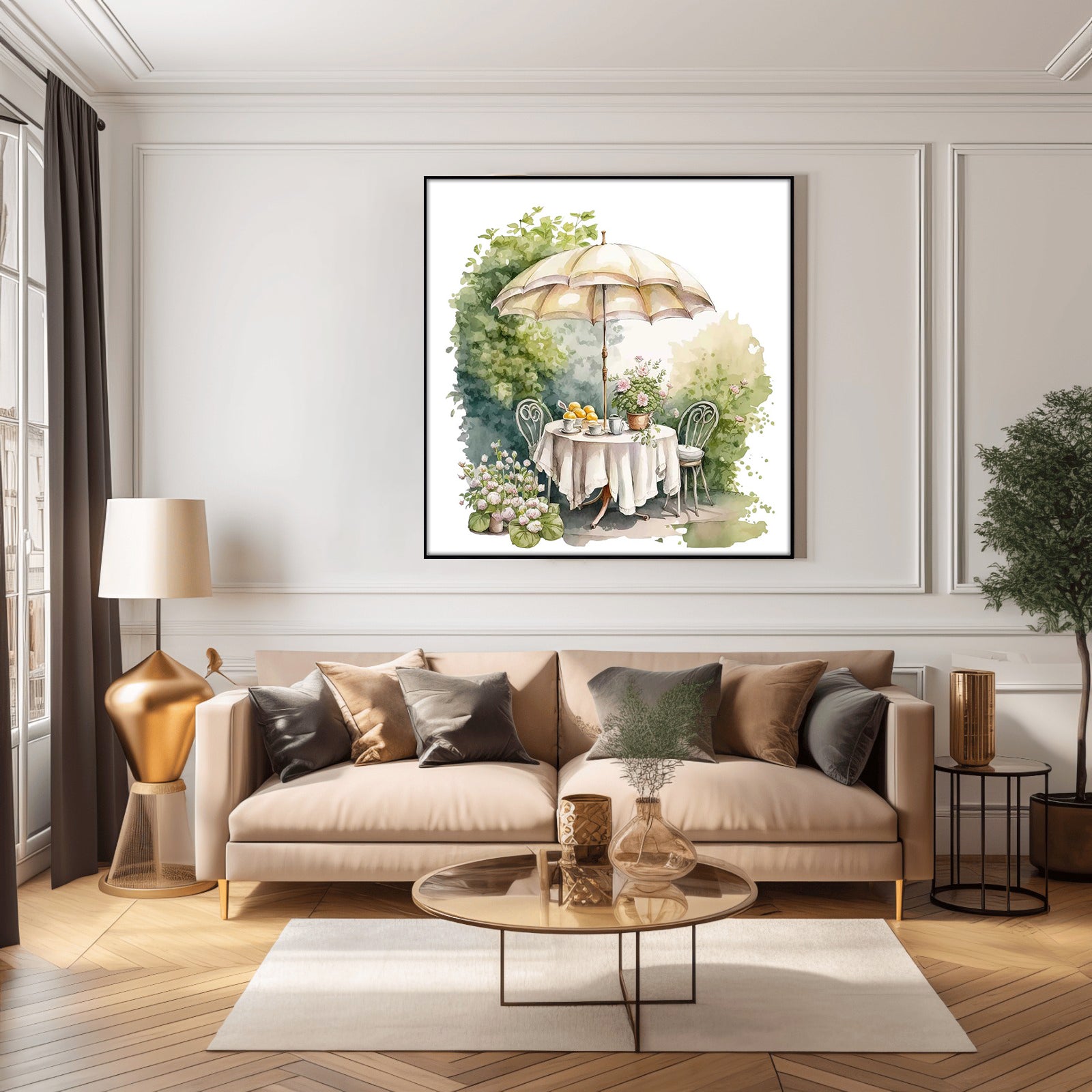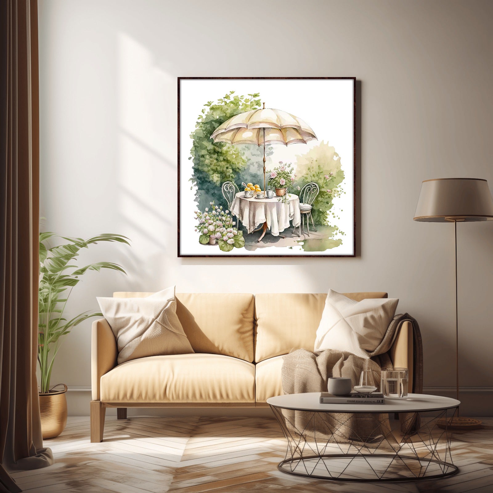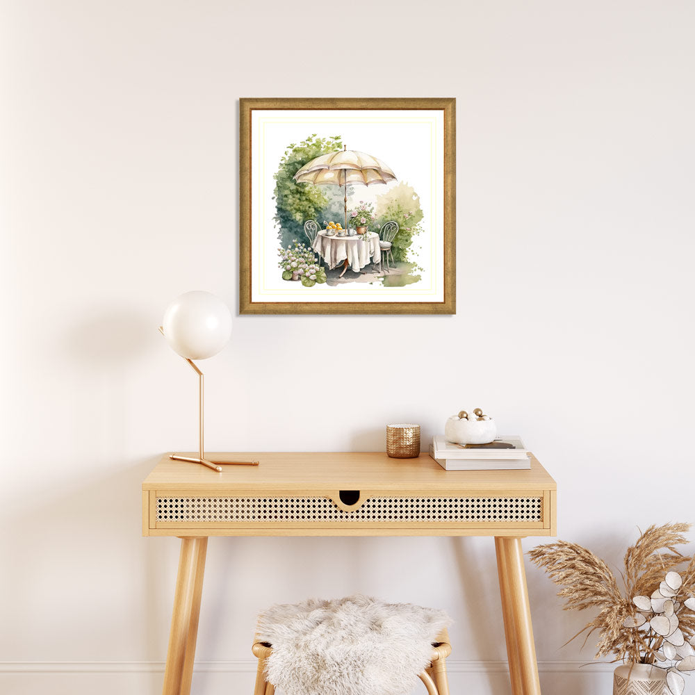 Enjoy the season of renewal with this beautiful spring tea time print. Featuring a delicate water colour painting of a garden picnic, it's the perfect way to add a fresh look to any room. Create a tranquil moment reminiscent of spring's beauty and sunshine.