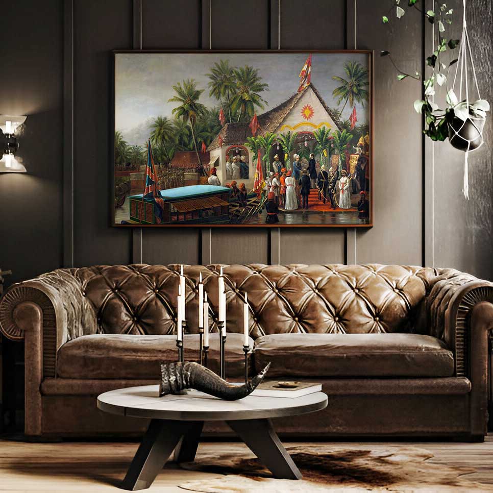 Explore the rich history of India with this beautifully crafted Raja Ravi Varma Painting. Featuring 50 historic meetings, this masterpiece captures the essence of Indian culture and heritage. Immerse yourself in the intricate details and vivid colors of this exquisite painting. Perfect for art enthusiasts and history lovers alike.