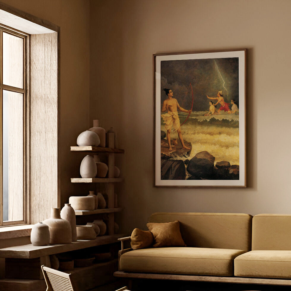 Discover the mesmerizing art of Rama is placated by the fearful sea god. This stunning piece portrays the power and reverence of the sea god through intricate details and expert craftsmanship. Enhance your space with a touch of cultural and spiritual significance.