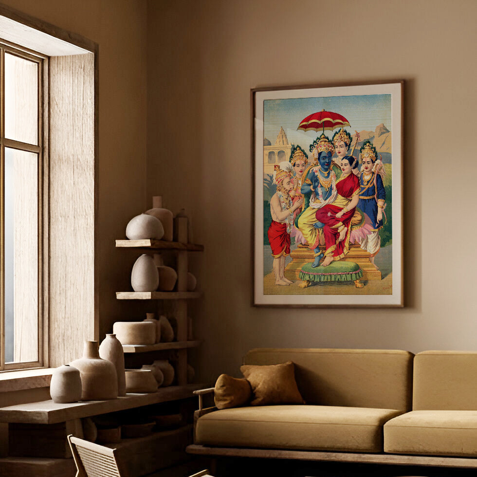 Ramapanchayan is a distinguished form of traditional Indian art depicting scenes from the epic Ramayana. Each meticulously crafted painting showcases intricate detailing, vibrant color palettes, and authentic artistic techniques passed down through generations. This exquisite piece serves as both a cultural artifact and an elegant decorative element, bringing classical Indian mythology and artistic heritage into contemporary spaces.