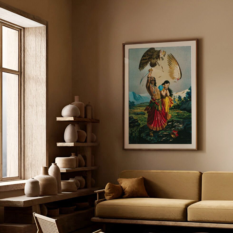 This exquisite painting depicts the dramatic confrontation from the Ramayana where Ravana, the ten-headed demon king, battles Jatayu, the noble vulture who attempted to rescue Sita. The artwork masterfully captures the tension and movement of this pivotal mythological moment, showcasing the artist's command of traditional Indian artistic techniques. The composition balances dynamic action with meticulous attention to iconographic details, making it a significant addition for collectors of classical Indian narrative art and religious iconography.