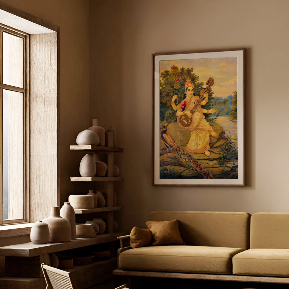 Experience the beauty of Indian art with our Saraswati Devi painting. Hand-painted by skilled artists, this masterpiece depicts the goddess of knowledge, music, and arts. Bring home the divine energy and enhance your home decor with this unique piece.
