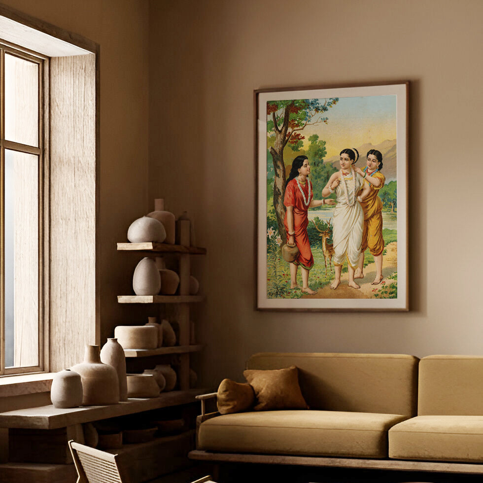 Experience the beauty and eternal bond between Shakuntala and her companions with our Shakuntala and Sakhis painting. This exquisite piece captures the essence of their story, allowing you to bring home a piece of Indian history and mythology. Discover the true meaning of friendship and love with this stunning artwork.