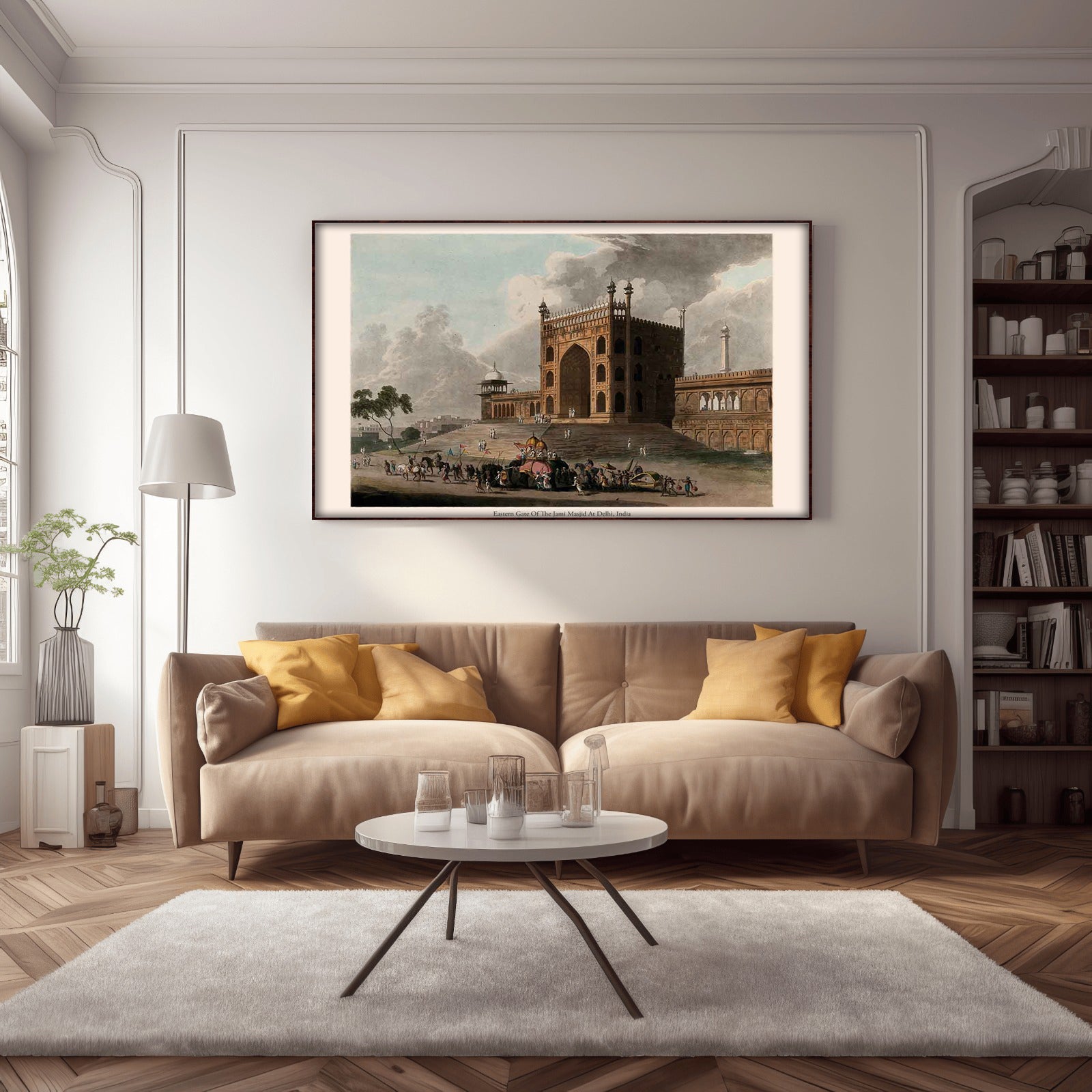 This print depicts the iconic Eastern Gate of the Jami Masjid at Delhi, India. It showcases intricate architectural details and cultural significance. Bring a piece of Indian history and art into your home with this stunning print.