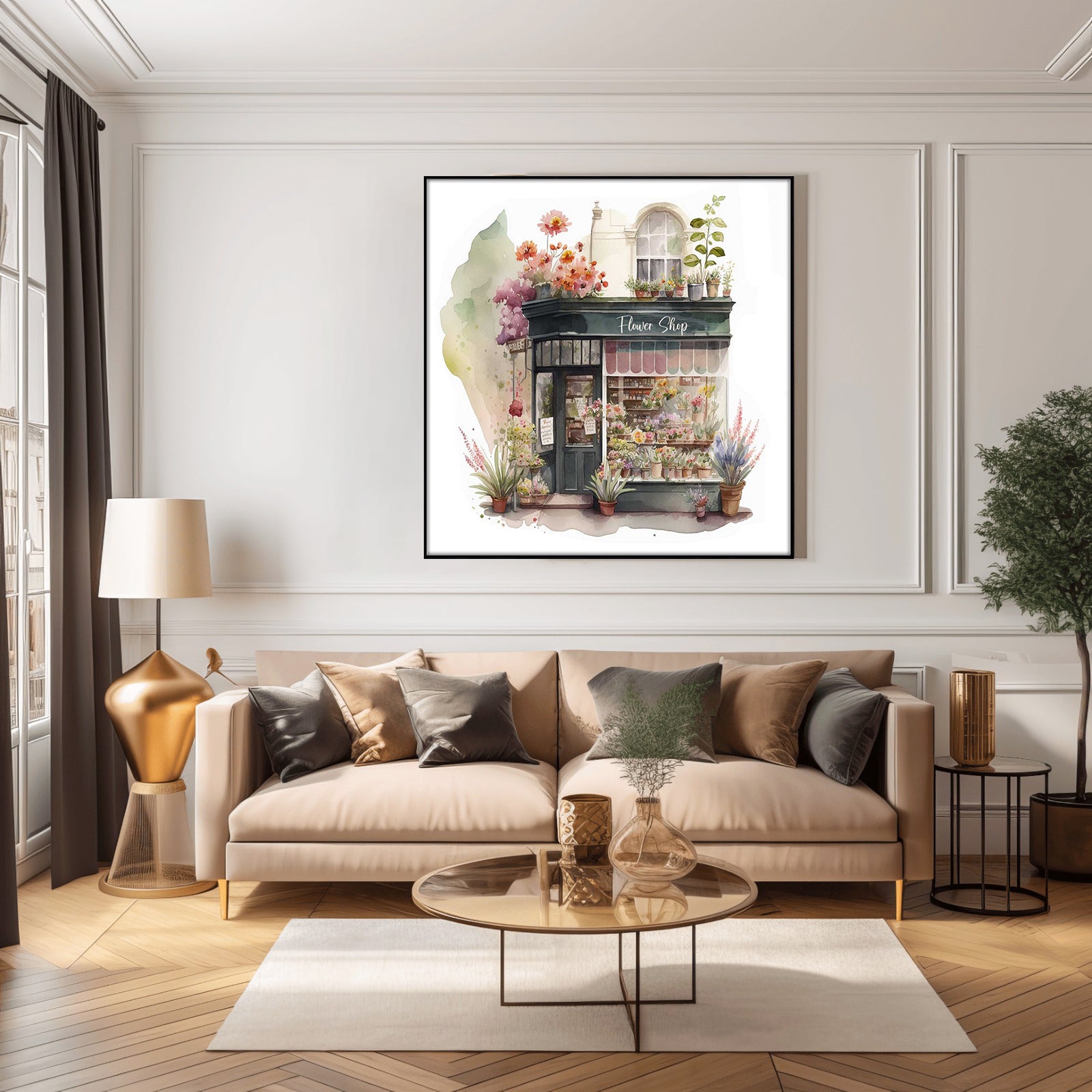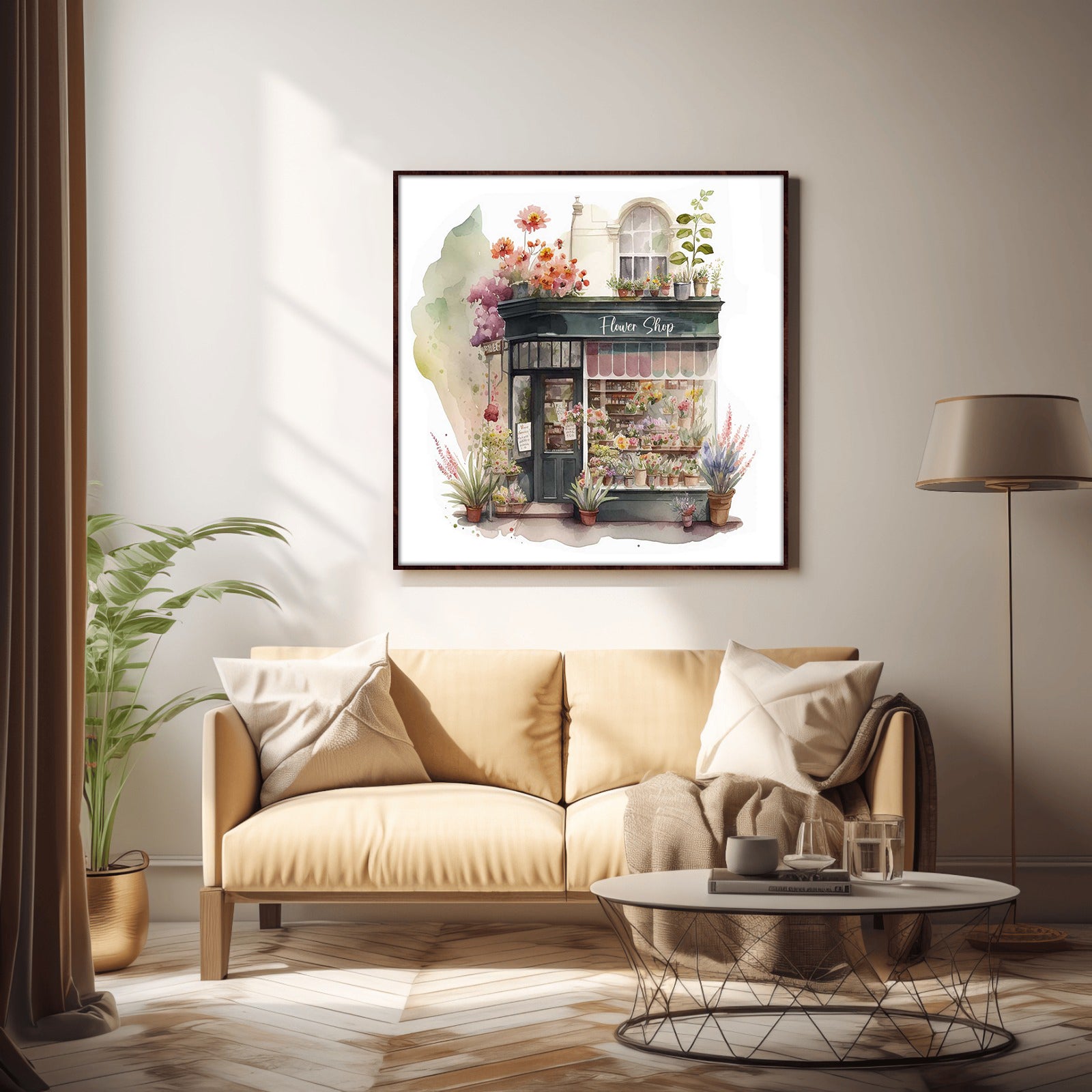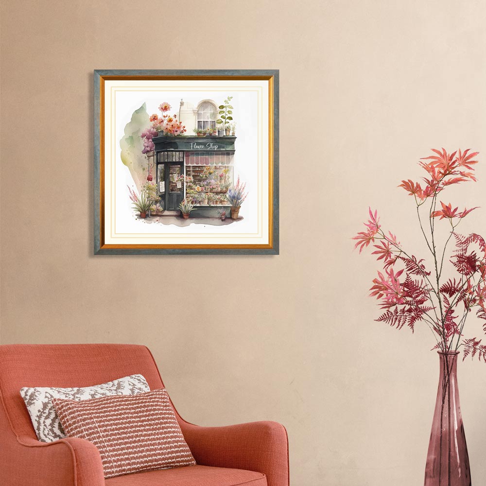 This beautiful flower shop print is a premium water colour print featuring a naturalistic flower shop. Enjoy the realistic detail of this sophisticated design, perfect for bringing a natural touch to any home decor.