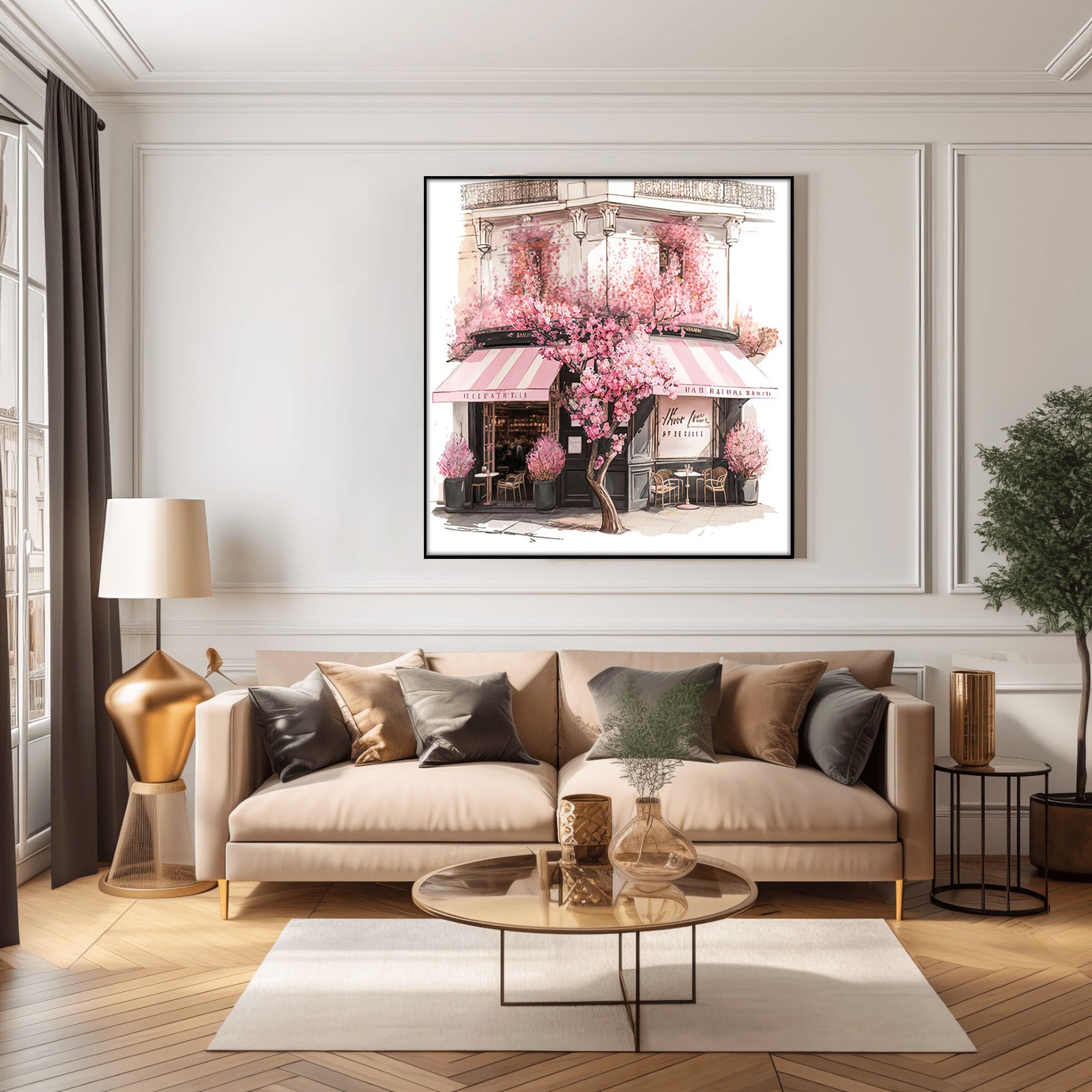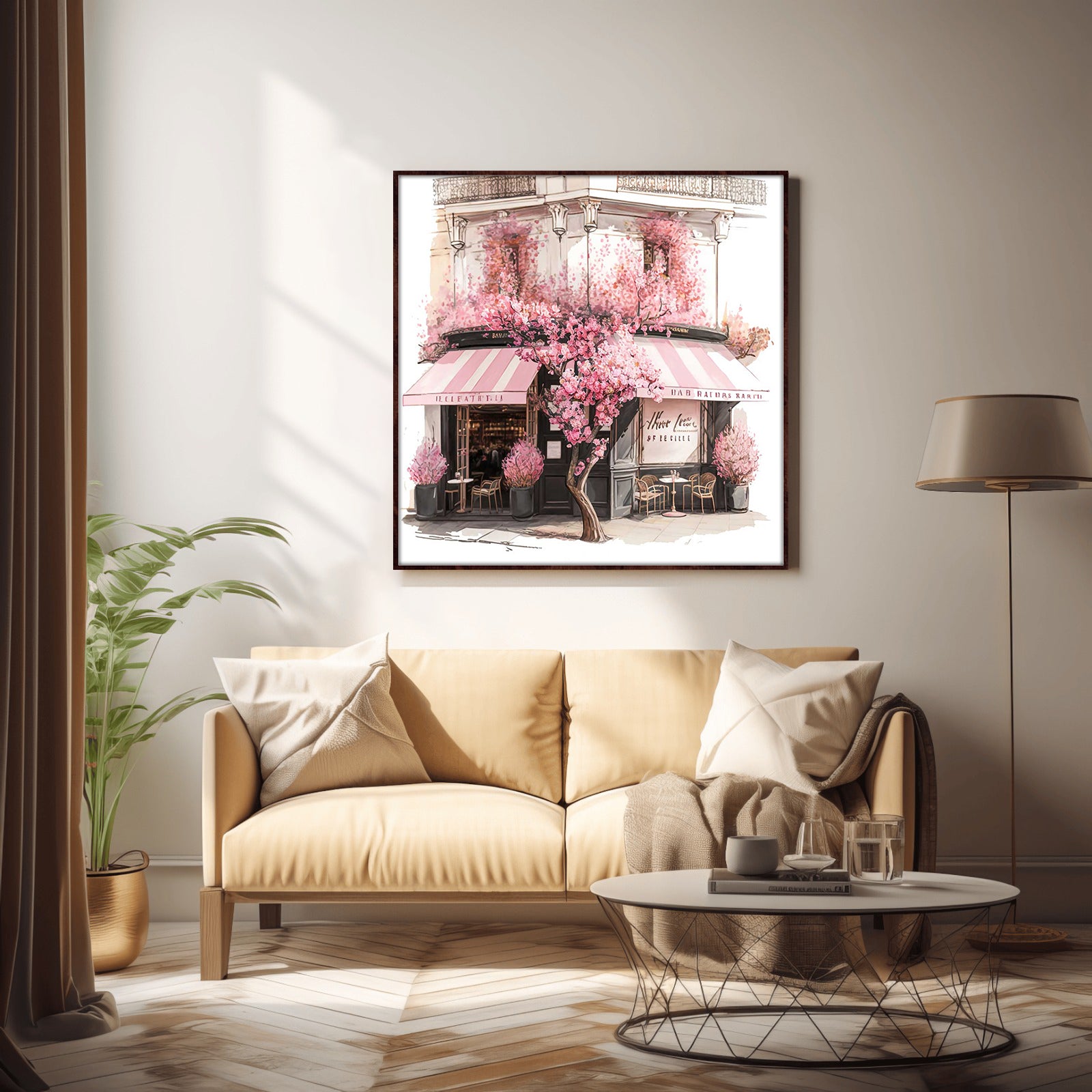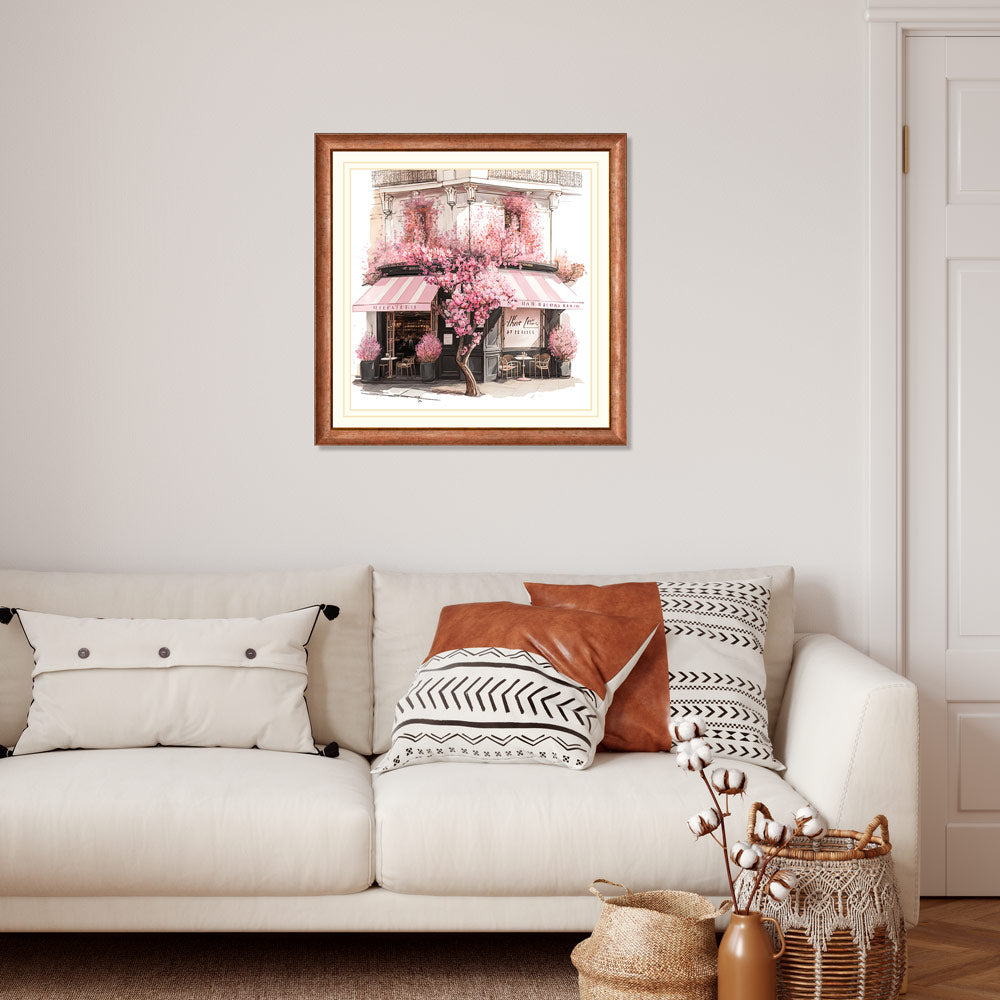 This stunning water colour print of a coffee shop surrounded by beautiful blooms is a must-have for any home. With its vibrant colours and intricate details, this piece is sure to bring a sense of life and style to any room.