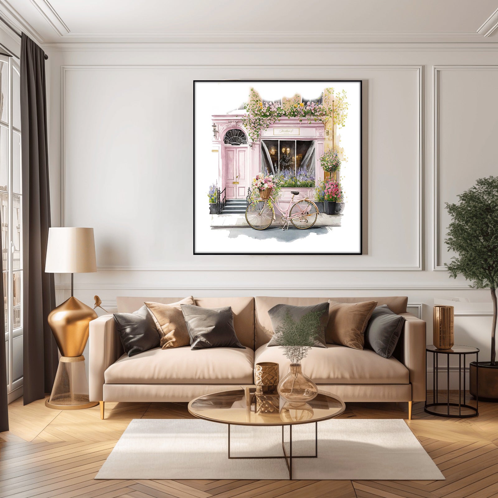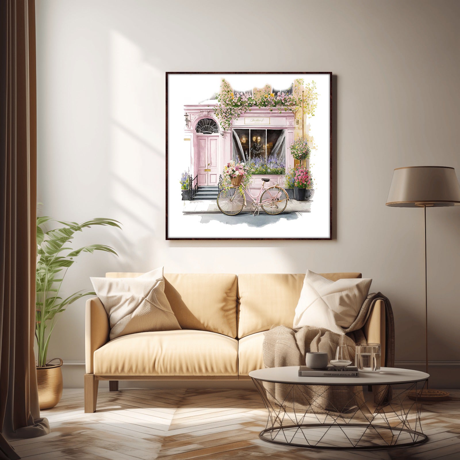 This beautiful water colour print, featuring a summer cafe and a floral bicycle, will add a touch of whimsy to any room. The vibrant colours will make a cheerful statement in any décor.