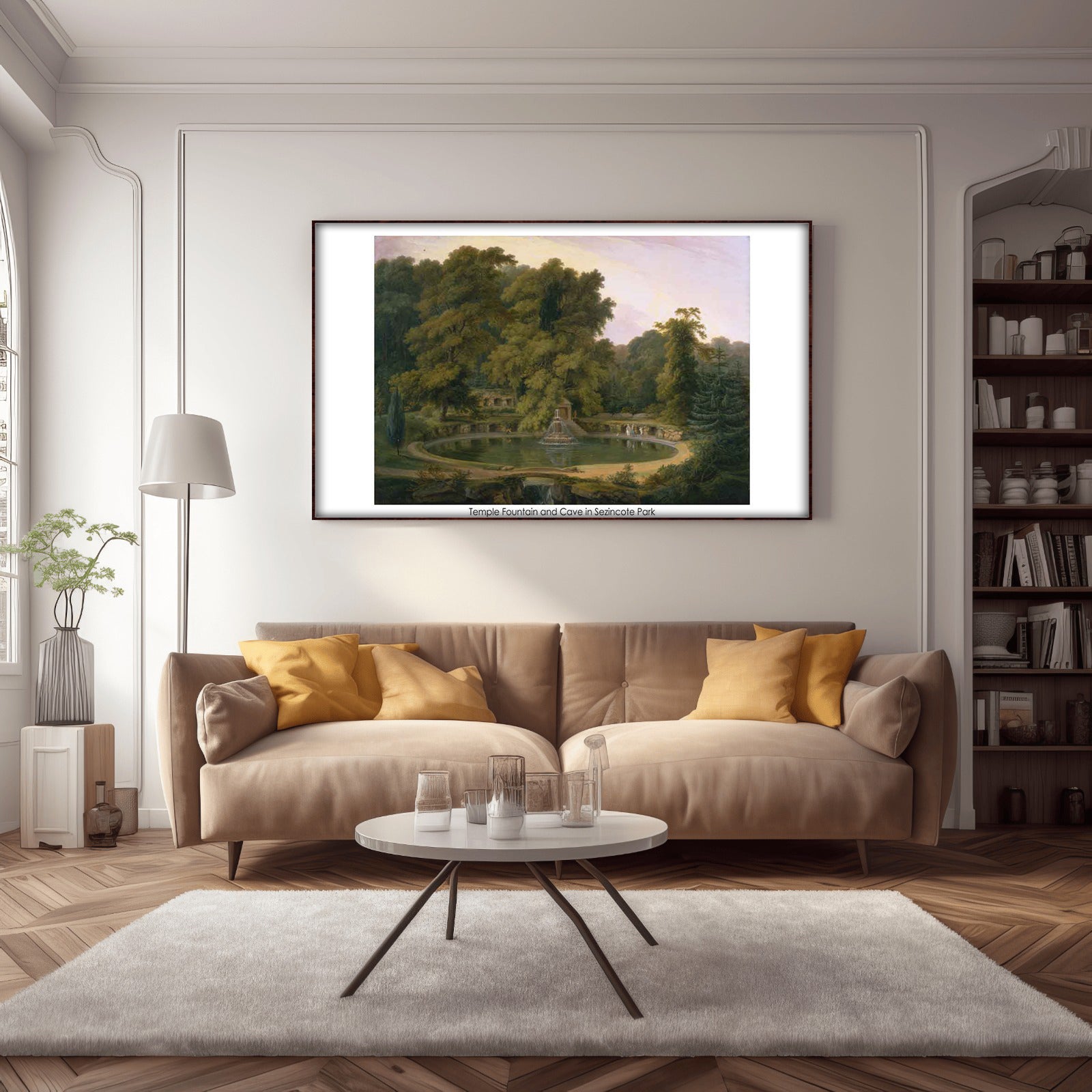 Discover the beauty and serenity of Sezincote Park with our Temple Fountain And Cave print. View the intricate details of the architectural masterpiece and bring a touch of sophistication to your home. Printed on high-quality materials for stunning clarity and lasting durability.