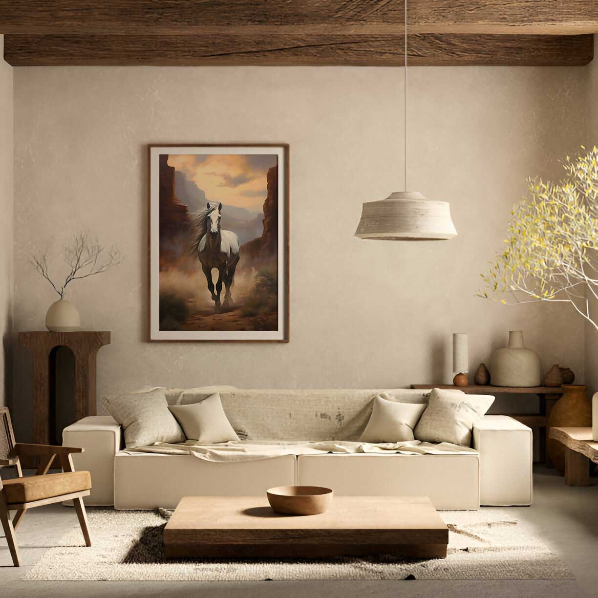 Capture the striking contrast of a white horse against the vast desert landscape with this expertly crafted print. Ideal for adding a touch of elegance and natural beauty to any space, this artwork highlights the serene strength and grace of the horse amidst the arid backdrop. Perfect for enthusiasts of wildlife and nature-inspired decor seeking a sophisticated statement piece.
