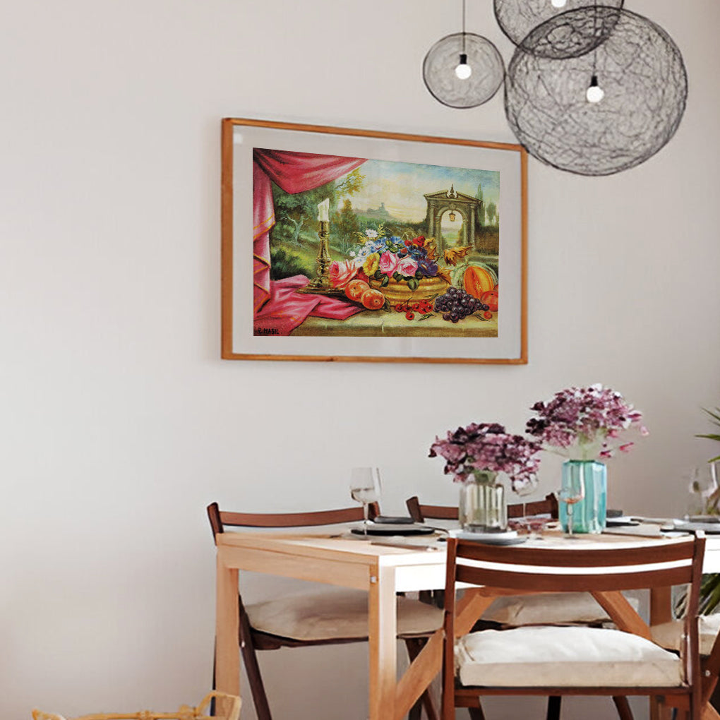 Enhanced with a stylish wood frame, this painting exudes a timeless allure, while lending an artistic touch to your living spaces.