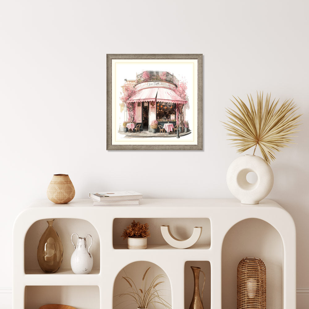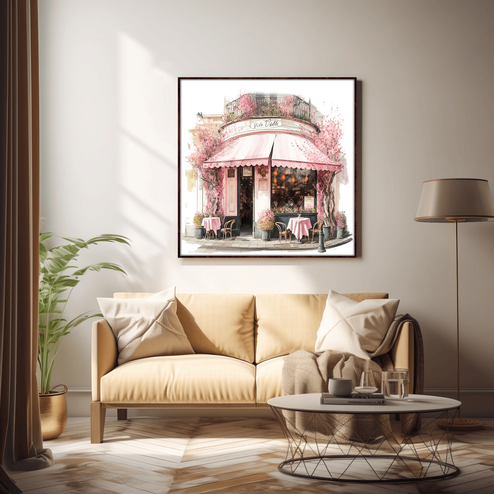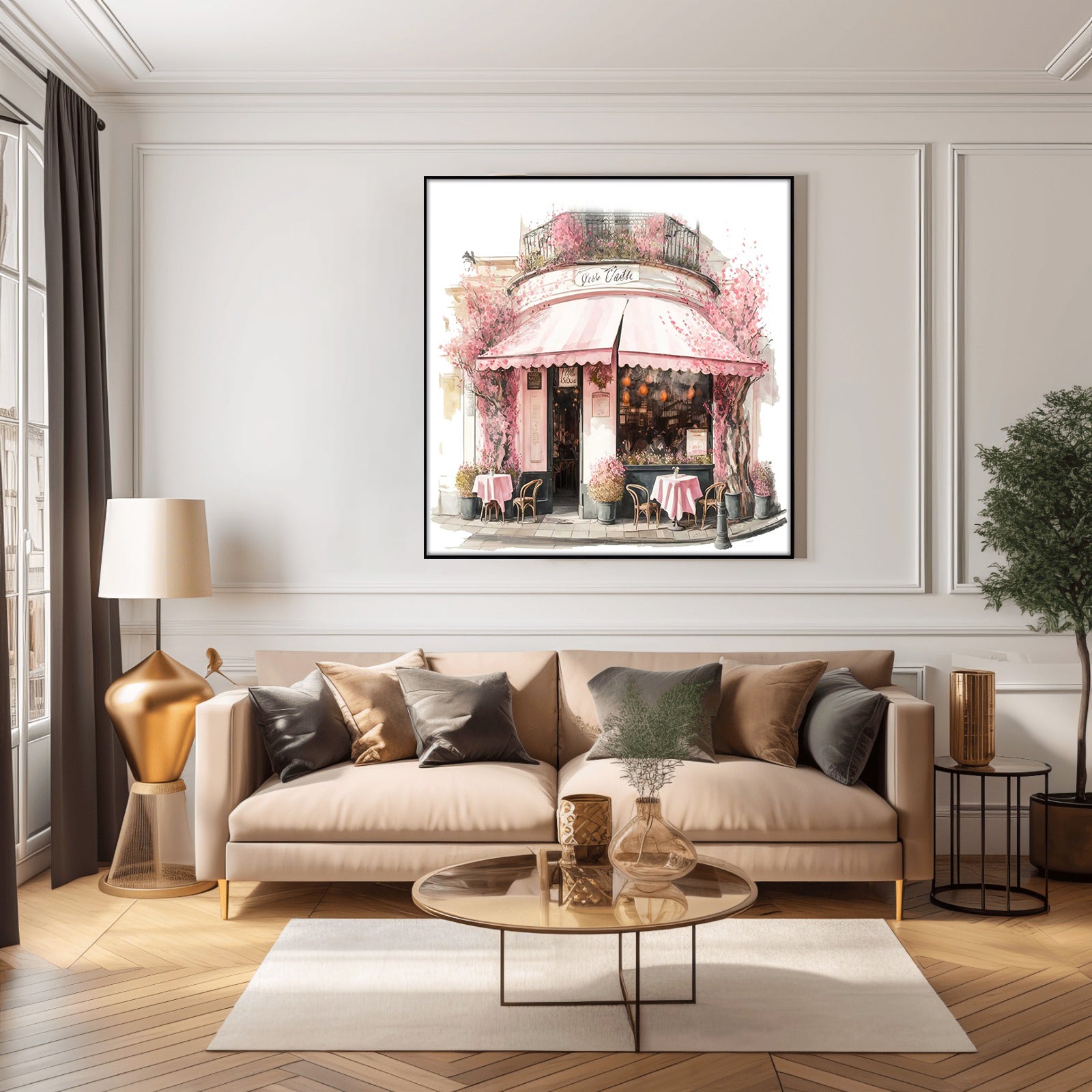 This stunning water colour print of a coffee shop surrounded by beautiful blooms is a must-have for any home. With its vibrant colours and intricate details, this piece is sure to bring a sense of life and style to any room.
