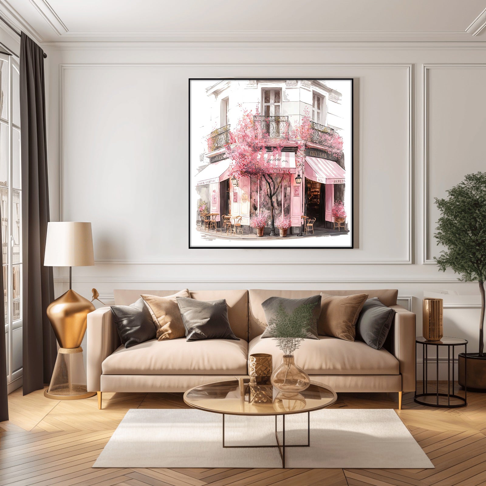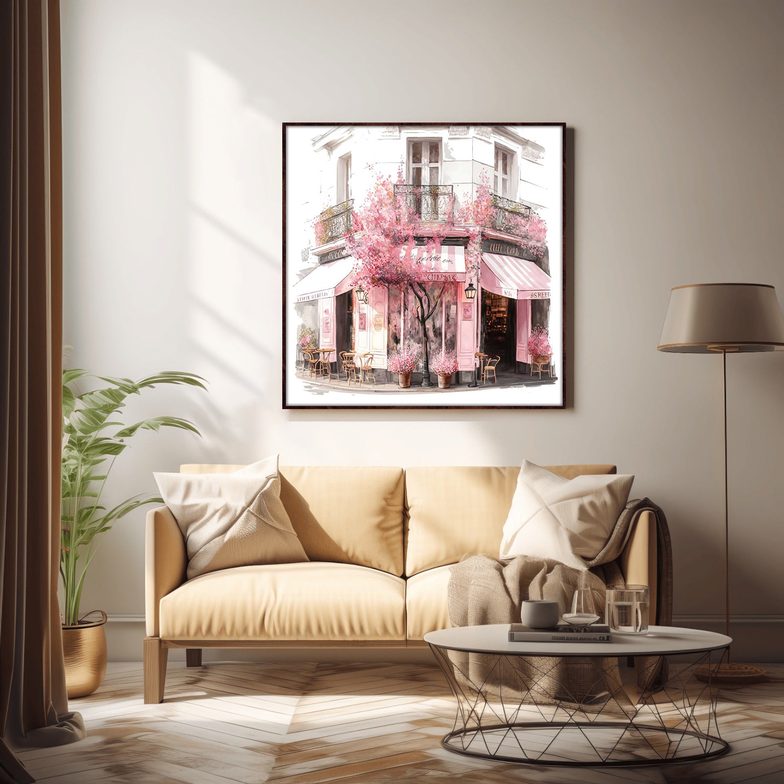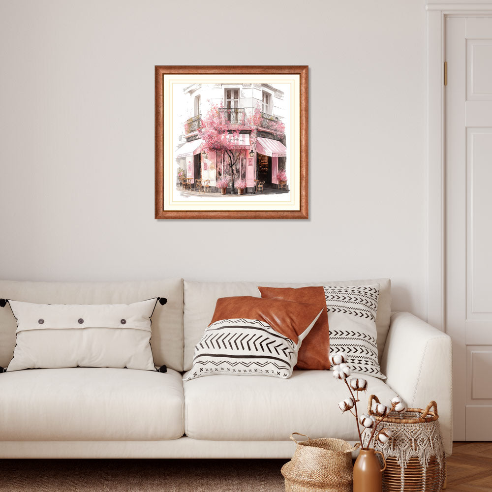 This stunning water colour print of a coffee shop surrounded by beautiful blooms is a must-have for any home. With its vibrant colours and intricate details, this piece is sure to bring a sense of life and style to any room.