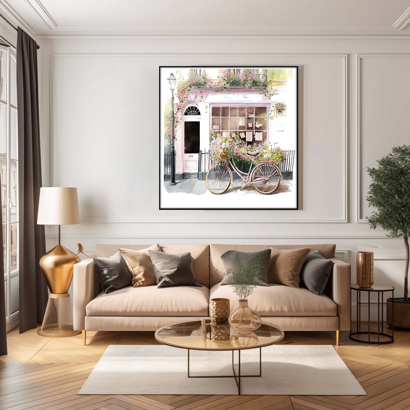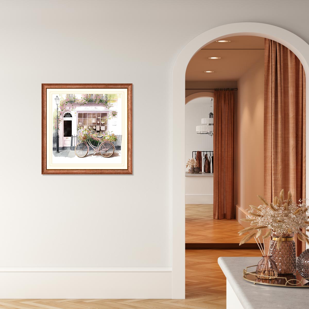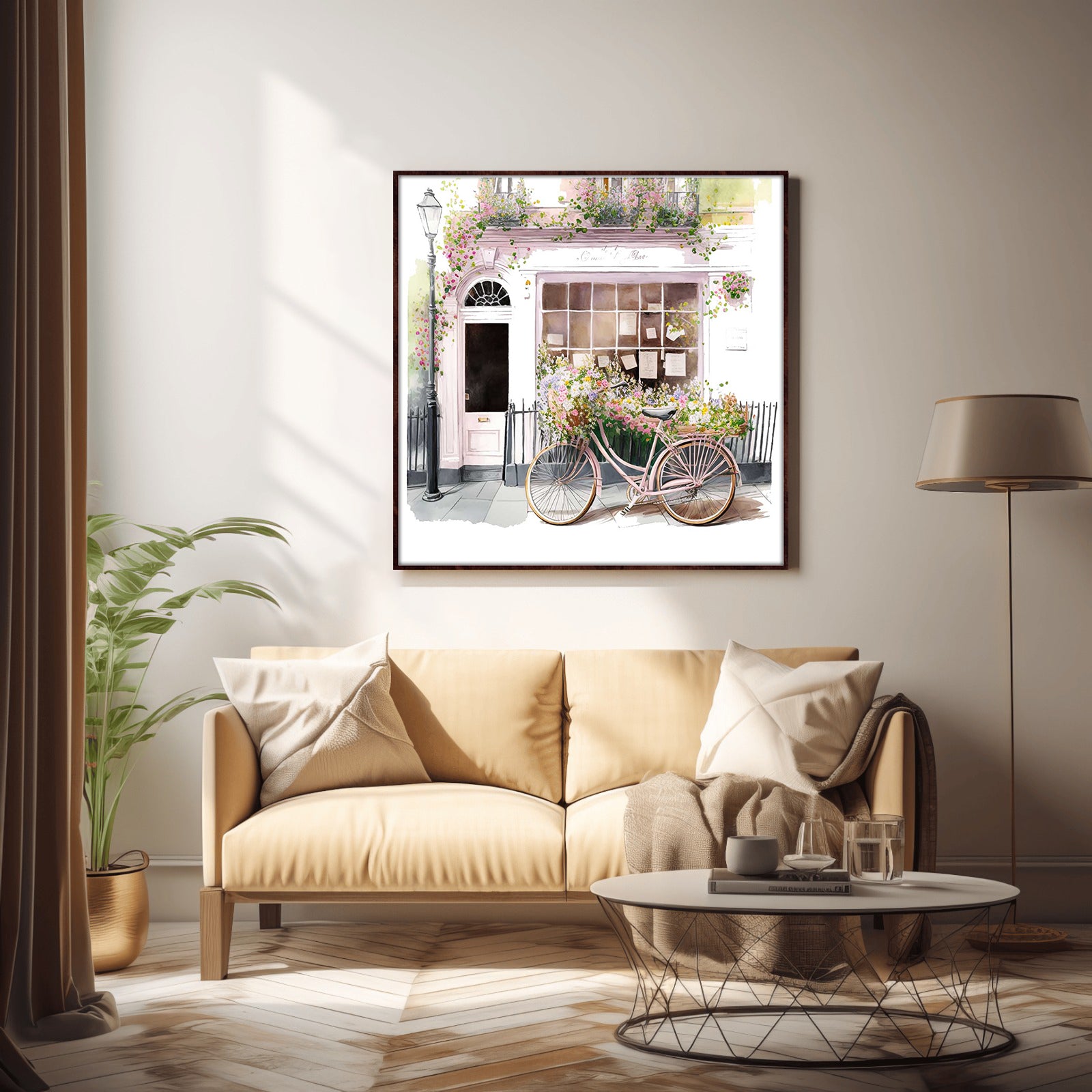 This beautiful water colour print, featuring a summer cafe and a floral bicycle, will add a touch of whimsy to any room. The vibrant colours will make a cheerful statement in any décor.