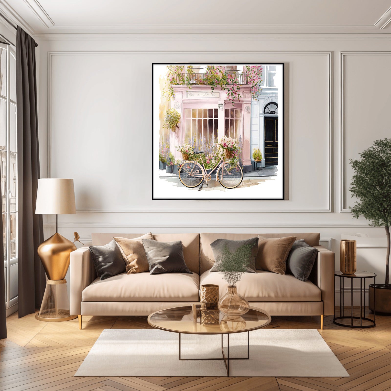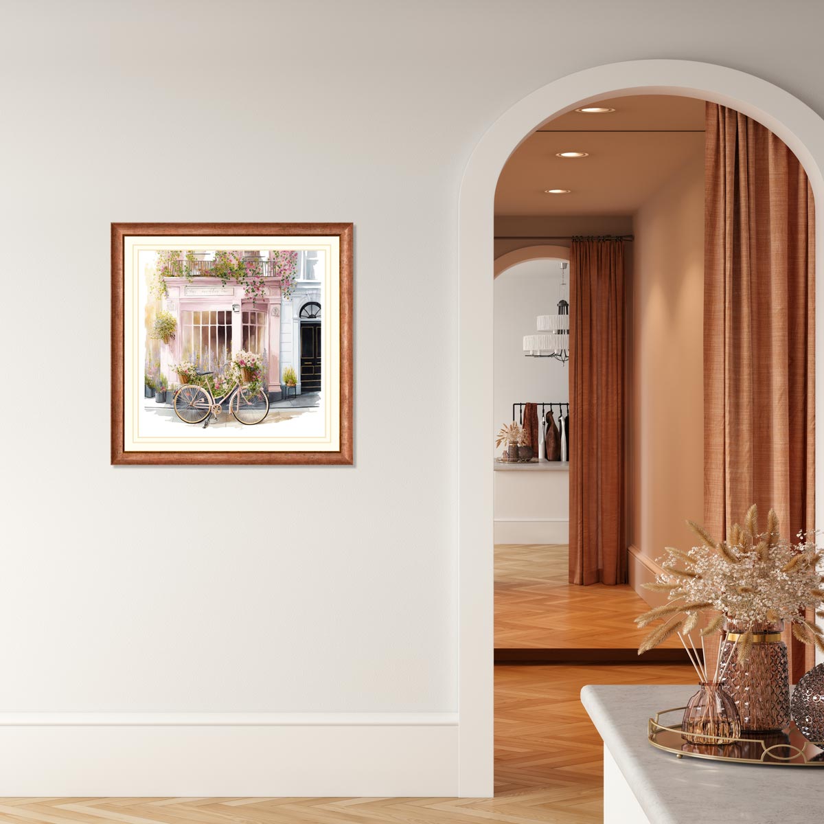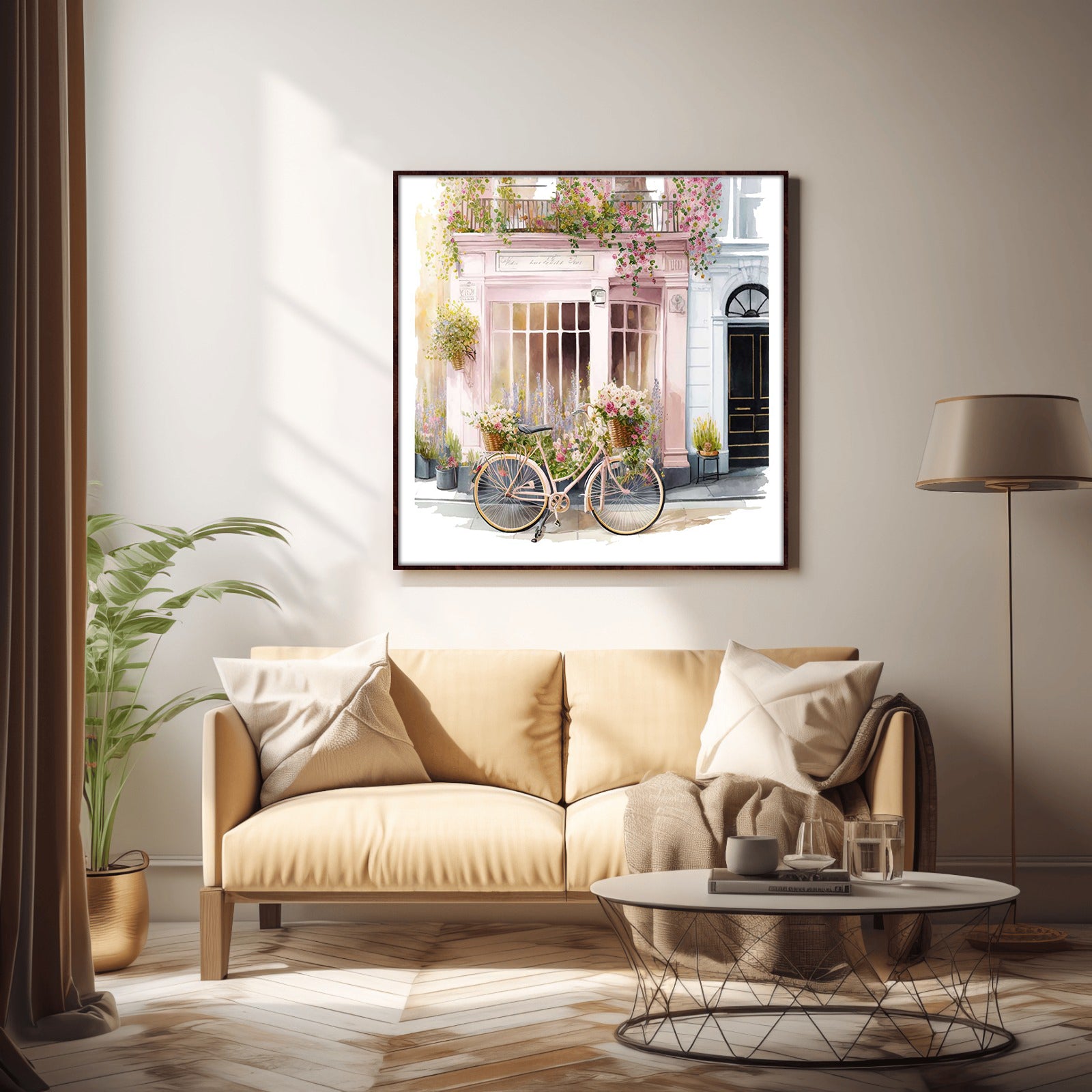 This beautiful water colour print, featuring a summer cafe and a floral bicycle, will add a touch of whimsy to any room. The vibrant colours will make a cheerful statement in any décor.