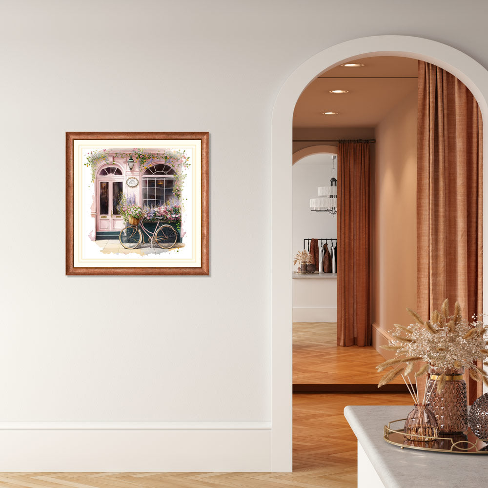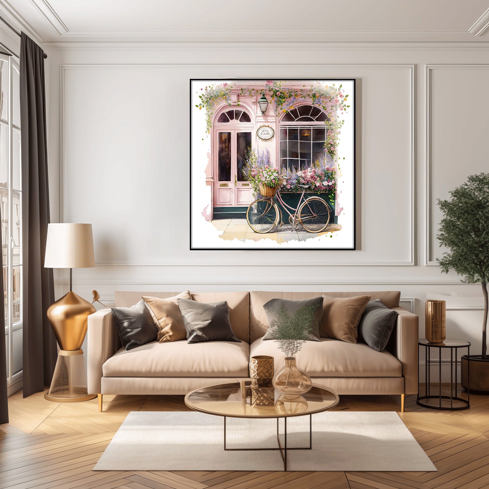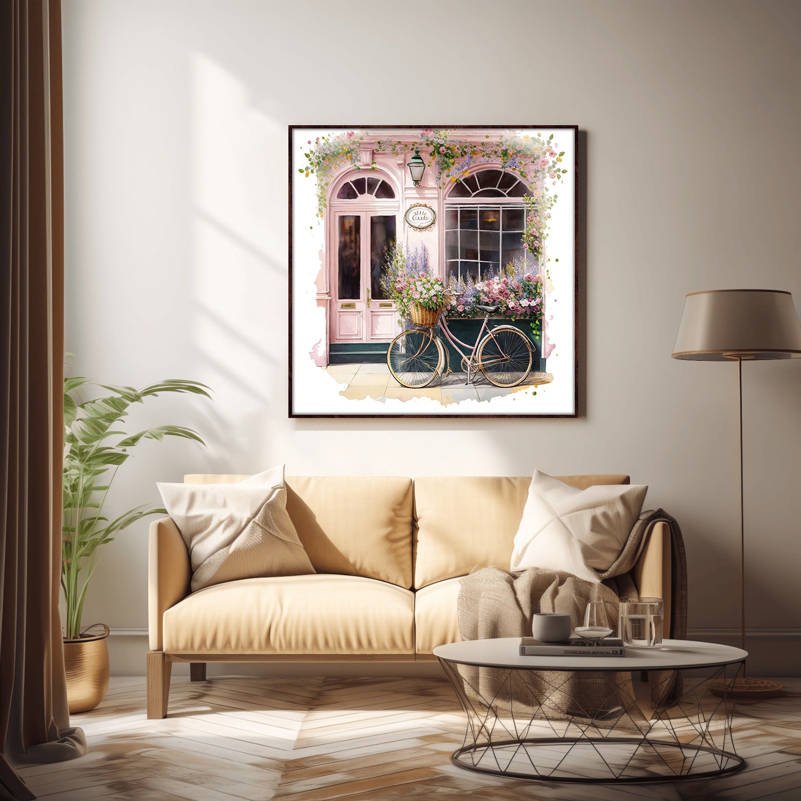 This beautiful water colour print, featuring a summer cafe and a floral bicycle, will add a touch of whimsy to any room. The vibrant colours will make a cheerful statement in any décor.