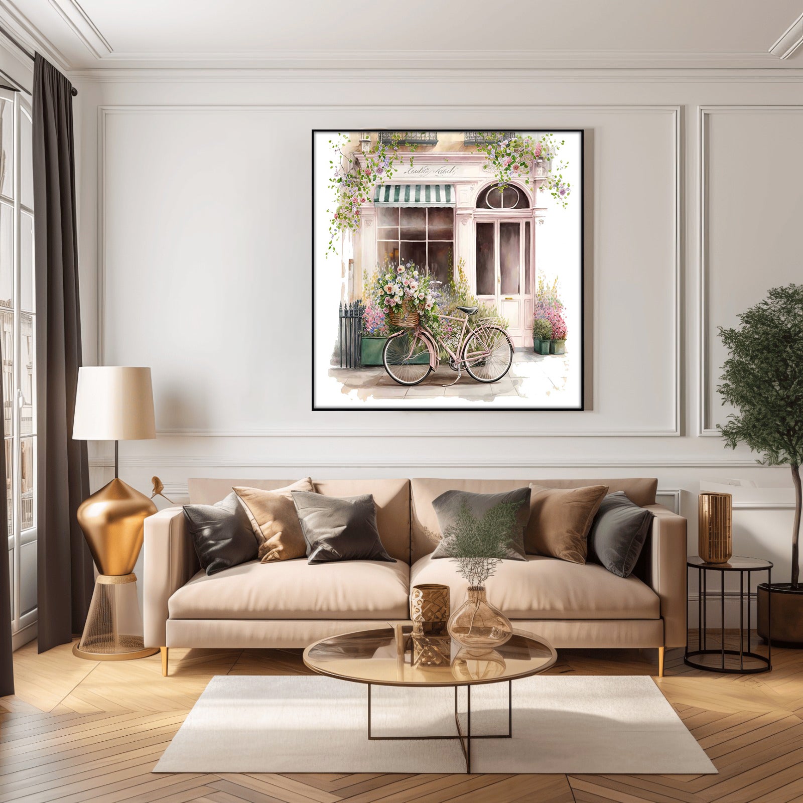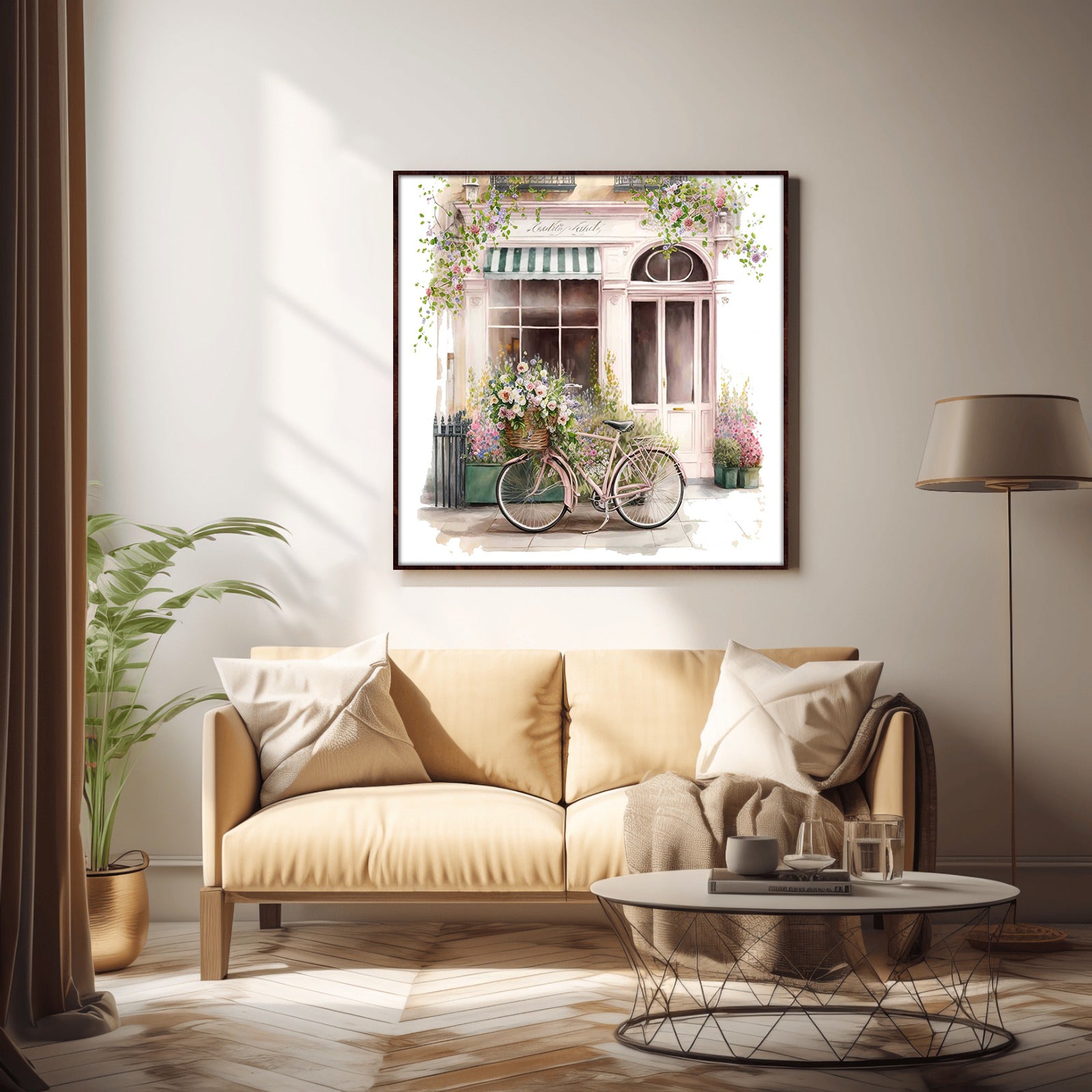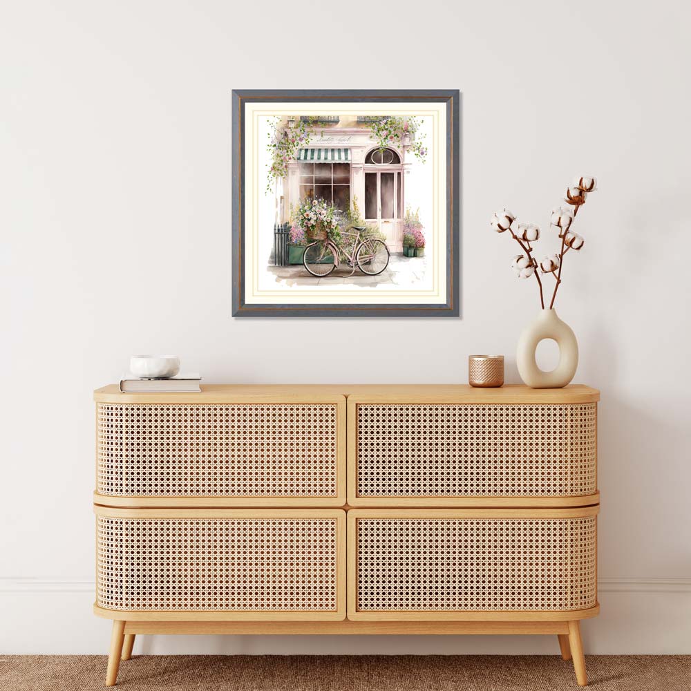 This beautiful water colour print, featuring a summer cafe and a floral bicycle, will add a touch of whimsy to any room. The vibrant colours will make a cheerful statement in any décor.