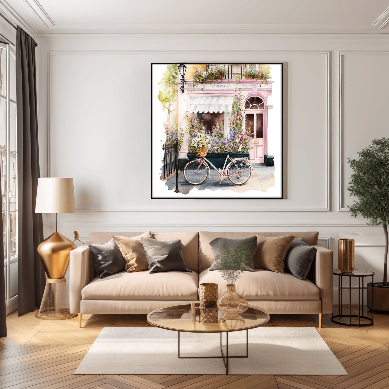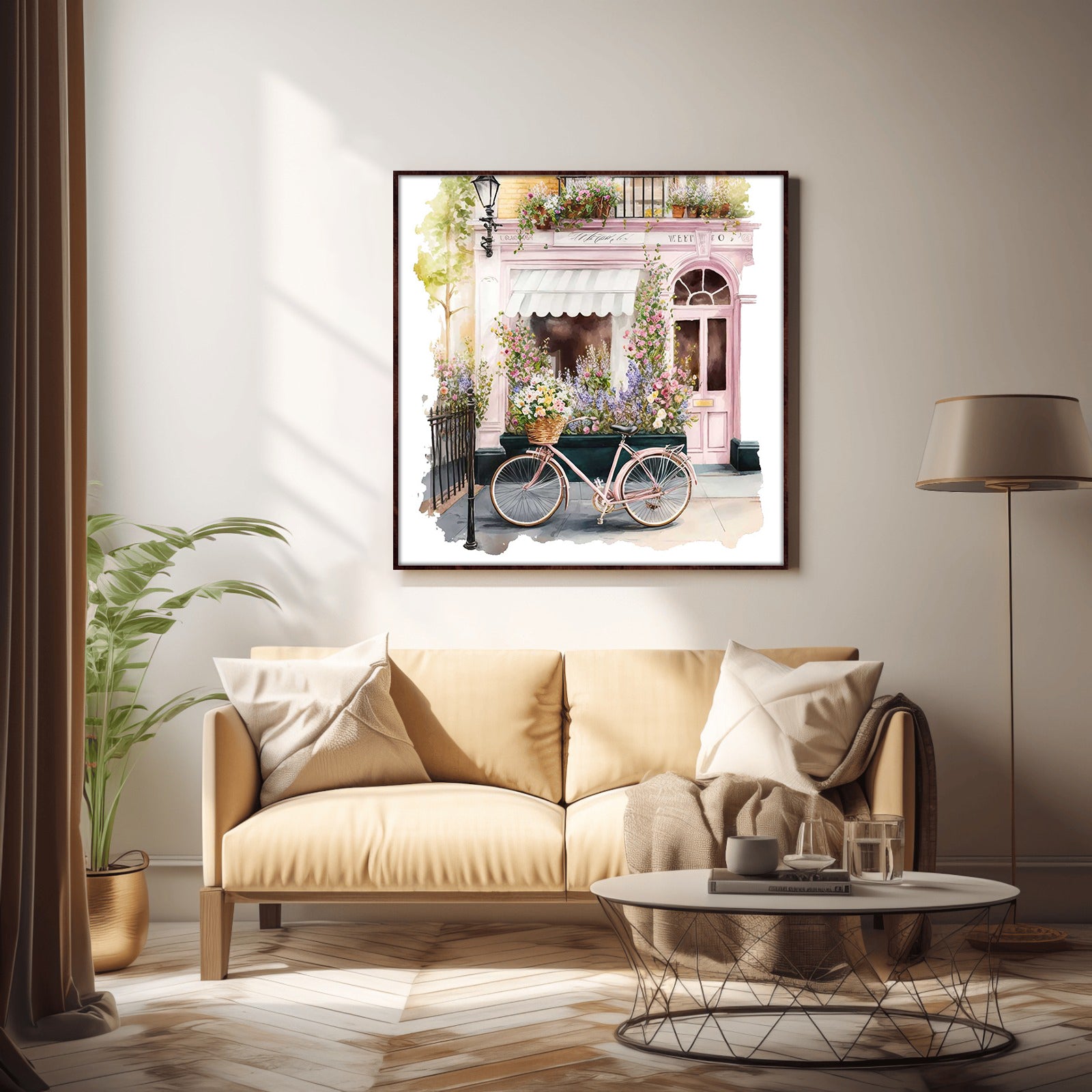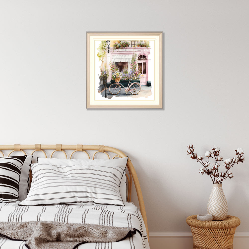 This beautiful water colour print, featuring a summer cafe and a floral bicycle, will add a touch of whimsy to any room. The vibrant colours will make a cheerful statement in any décor.